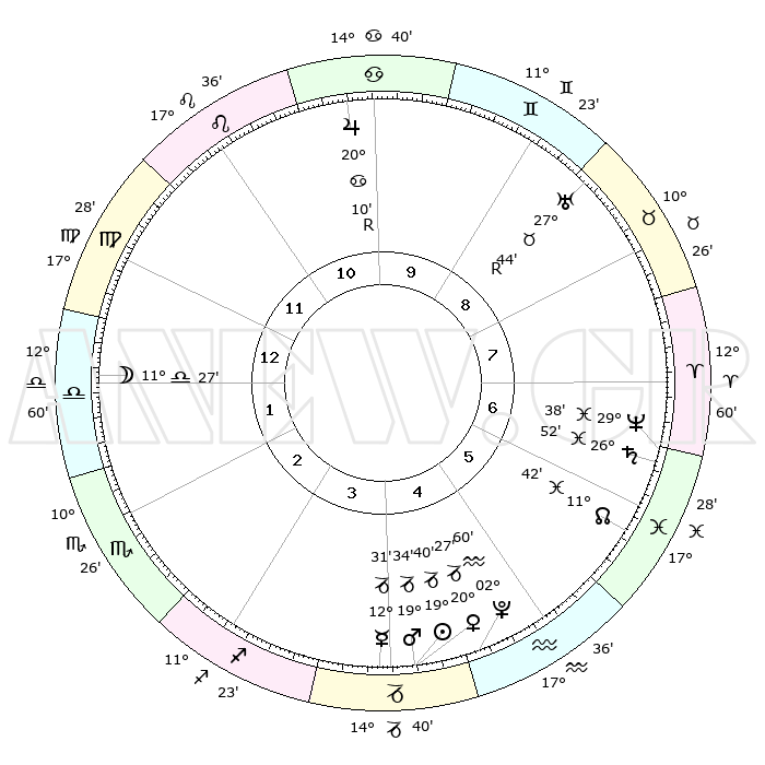 | | ΘΕΣΕΙΣ ΠΛΑΝΗΤΩΝ ΑΣΤΡΟΛΟΓΙΚΟΥ ΧΑΡΤΗ ΤΗΣ ΣΤΙΓΜΗΣ ΑΥΤΗΣ | | | | Πλανήτης | Ζώδιο | Μοίρες | Δεκαήμ. | Σε οίκο | Απόκλιση | | Ακμές των οίκων | | Ηλιος | Αιγόκερως | 19°40' | Δεύτερο | 4 | 22 S 00 | | 1ος | 11°09' | Ζυγός | | Σελήνη | Ζυγός | 11°23' | Δεύτερο | 1 | 06 S 56 | | 2ος | 08°29' | Σκορπιός | | Ερμής | Αιγόκερως | 12°31' | Δεύτερο | 3 | 24 S 16 | | 3ος | 09°21' | Τοξότης | | Αφροδίτη | Αιγόκερως | 20°26' | Τρίτο | 4 | 22 S 41 | | 4ος | 12°34' | Αιγόκερως | | Αρης | Αιγόκερως | 19°34' | Δεύτερο | 4 | 22 S 56 | | 5ος | 15°30' | Υδροχόος | | Δίας | Καρκίνος | 20°10'R | Τρίτο | 10 | 22 N 11 | | 6ος | 15°28' | Ιχθείς | | Κρόνος | Ιχθείς | 26°52' | Τρίτο | 6 | 03 S 18 | | 7ος | 11°09' | Κριός | | Ουρανός | Ταύρος | 27°44'R | Τρίτο | 8 | 19 N 27 | | 8ος | 08°29' | Ταύρος | | Ποσειδώνας | Ιχθείς | 29°38' | Τρίτο | 6 | 01 S 22 | | 9ος | 09°21' | Δίδυμοι | | Πλούτωνας | Υδροχόος | 02°60' | Πρώτο | 4 | 23 S 10 | | 10ος | 12°34' | Καρκίνος | | Β. Δεσμός | Ιχθείς | 11°42' | Δεύτερο | 5 | 07 S 10 | | 11ος | 15°30' | Λέων | | Ωροσκόπος | Ζυγός | 11°09' | Δεύτερο | | | 12ος | 15°28' | Παρθένος | | Μεσουράνημα | Καρκίνος | 12°34' | Δεύτερο | | | |