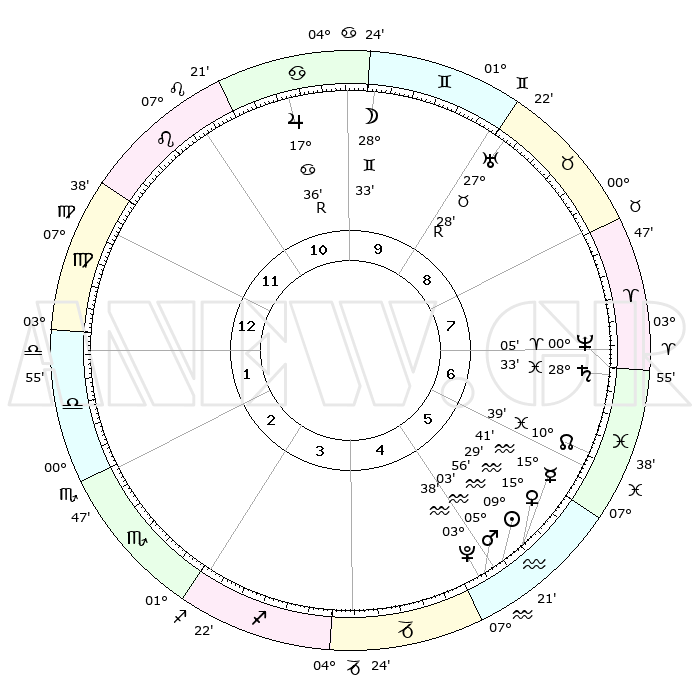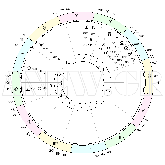 | | ΘΕΣΕΙΣ ΠΛΑΝΗΤΩΝ ΑΣΤΡΟΛΟΓΙΚΟΥ ΧΑΡΤΗ ΤΗΣ ΣΤΙΓΜΗΣ ΑΥΤΗΣ | | | | Πλανήτης | Ζώδιο | Μοίρες | Δεκαήμ. | Σε οίκο | Απόκλιση | | Ακμές των οίκων | | Ηλιος | Υδροχόος | 09°51' | Πρώτο | 5 | 17 S 46 | | 1ος | 11°38' | Παρθένος | | Σελήνη | Δίδυμοι | 27°27' | Τρίτο | 10 | 28 N 21 | | 2ος | 06°40' | Ζυγός | | Ερμής | Υδροχόος | 15°33' | Δεύτερο | 6 | 18 S 04 | | 3ος | 06°13' | Σκορπιός | | Αφροδίτη | Υδροχόος | 15°23' | Δεύτερο | 6 | 17 S 29 | | 4ος | 09°10' | Τοξότης | | Αρης | Υδροχόος | 04°59' | Πρώτο | 5 | 20 S 01 | | 5ος | 12°41' | Αιγόκερως | | Δίας | Καρκίνος | 17°37'R | Δεύτερο | 11 | 22 N 34 | | 6ος | 13°53' | Υδροχόος | | Κρόνος | Ιχθείς | 28°32' | Τρίτο | 7 | 02 S 35 | | 7ος | 11°38' | Ιχθείς | | Ουρανός | Ταύρος | 27°28'R | Τρίτο | 9 | 19 N 24 | | 8ος | 06°40' | Κριός | | Ποσειδώνας | Κριός | 00°05' | Πρώτο | 7 | 01 S 11 | | 9ος | 06°13' | Ταύρος | | Πλούτωνας | Υδροχόος | 03°38' | Πρώτο | 5 | 23 S 02 | | 10ος | 09°10' | Δίδυμοι | | Β. Δεσμός | Ιχθείς | 10°39' | Δεύτερο | 6 | 07 S 34 | | 11ος | 12°41' | Καρκίνος | | Ωροσκόπος | Παρθένος | 11°38' | Δεύτερο | | | 12ος | 13°53' | Λέων | | Μεσουράνημα | Δίδυμοι | 09°10' | Πρώτο | | | |