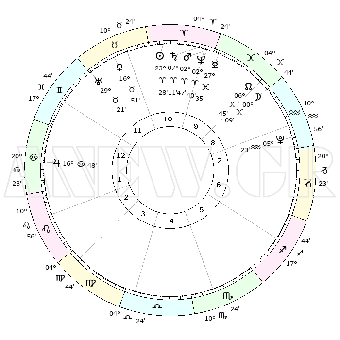 | | ΘΕΣΕΙΣ ΠΛΑΝΗΤΩΝ ΑΣΤΡΟΛΟΓΙΚΟΥ ΧΑΡΤΗ ΤΗΣ ΣΤΙΓΜΗΣ ΑΥΤΗΣ | | | | Πλανήτης | Ζώδιο | Μοίρες | Δεκαήμ. | Σε οίκο | Απόκλιση | | Ακμές των οίκων | | Ηλιος | Κριός | 23°06' | Τρίτο | 2 | 08 N 59 | | 1ος | 00°60' | Υδροχόος | | Σελήνη | Υδροχόος | 25°19' | Τρίτο | 1 | 14 S 10 | | 2ος | 15°15' | Ιχθείς | | Ερμής | Ιχθείς | 27°05' | Τρίτο | 2 | 03 S 28 | | 3ος | 23°33' | Κριός | | Αφροδίτη | Ταύρος | 16°24' | Δεύτερο | 3 | 16 N 49 | | 4ος | 21°50' | Ταύρος | | Αρης | Κριός | 02°30' | Πρώτο | 2 | 00 N 05 | | 5ος | 14°32' | Δίδυμοι | | Δίας | Καρκίνος | 16°46' | Δεύτερο | 6 | 22 N 45 | | 6ος | 05°59' | Καρκίνος | | Κρόνος | Κριός | 07°09' | Πρώτο | 2 | 00 N 52 | | 7ος | 00°60' | Λέων | | Ουρανός | Ταύρος | 29°20' | Τρίτο | 4 | 19 N 50 | | 8ος | 15°15' | Παρθένος | | Ποσειδώνας | Κριός | 02°39' | Πρώτο | 2 | 00 S 09 | | 9ος | 23°33' | Ζυγός | | Πλούτωνας | Υδροχόος | 05°23' | Πρώτο | 1 | 22 S 47 | | 10ος | 21°50' | Σκορπιός | | Β. Δεσμός | Ιχθείς | 06°46' | Πρώτο | 1 | 09 S 02 | | 11ος | 14°32' | Τοξότης | | Ωροσκόπος | Υδροχόος | 00°60' | Πρώτο | | | 12ος | 05°59' | Αιγόκερως | | Μεσουράνημα | Σκορπιός | 21°50' | Τρίτο | | | |