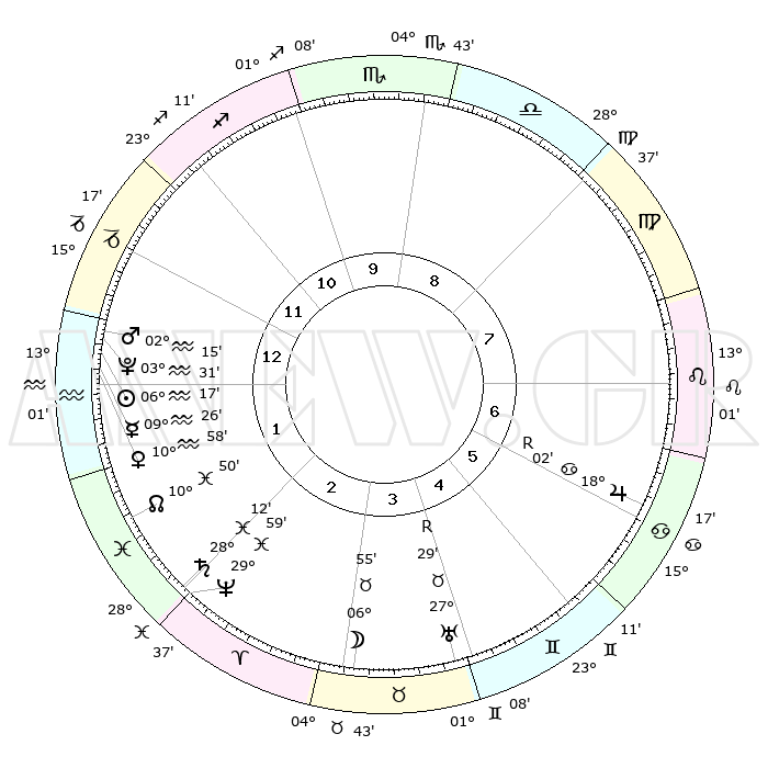 | | ΘΕΣΕΙΣ ΠΛΑΝΗΤΩΝ ΑΣΤΡΟΛΟΓΙΚΟΥ ΧΑΡΤΗ ΤΗΣ ΣΤΙΓΜΗΣ ΑΥΤΗΣ | | | | Πλανήτης | Ζώδιο | Μοίρες | Δεκαήμ. | Σε οίκο | Απόκλιση | | Ακμές των οίκων | | Ηλιος | Υδροχόος | 06°40' | Πρώτο | 7 | 18 S 36 | | 1ος | 27°51' | Καρκίνος | | Σελήνη | Ταύρος | 12°10' | Δεύτερο | 10 | 19 N 53 | | 2ος | 18°45' | Λέων | | Ερμής | Υδροχόος | 10°05' | Δεύτερο | 7 | 19 S 43 | | 3ος | 13°30' | Παρθένος | | Αφροδίτη | Υδροχόος | 11°26' | Δεύτερο | 7 | 18 S 34 | | 4ος | 14°16' | Ζυγός | | Αρης | Υδροχόος | 02°32' | Πρώτο | 7 | 20 S 35 | | 5ος | 20°21' | Σκορπιός | | Δίας | Καρκίνος | 17°59'R | Δεύτερο | 12 | 22 N 31 | | 6ος | 26°24' | Τοξότης | | Κρόνος | Ιχθείς | 28°15' | Τρίτο | 9 | 02 S 42 | | 7ος | 27°51' | Αιγόκερως | | Ουρανός | Ταύρος | 27°29'R | Τρίτο | 11 | 19 N 24 | | 8ος | 18°45' | Υδροχόος | | Ποσειδώνας | Κριός | 00°00'R | Πρώτο | 9 | 01 S 13 | | 9ος | 13°30' | Ιχθείς | | Πλούτωνας | Υδροχόος | 03°32' | Πρώτο | 7 | 23 S 03 | | 10ος | 14°16' | Κριός | | Β. Δεσμός | Ιχθείς | 10°49' | Δεύτερο | 8 | 07 S 31 | | 11ος | 20°21' | Ταύρος | | Ωροσκόπος | Καρκίνος | 27°51' | Τρίτο | | | 12ος | 26°24' | Δίδυμοι | | Μεσουράνημα | Κριός | 14°16' | Δεύτερο | | | |