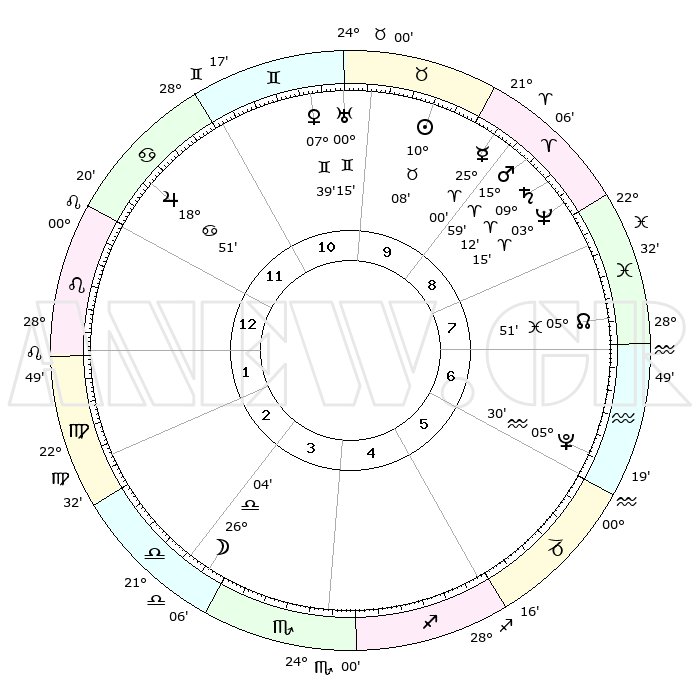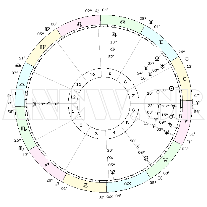 | | ΘΕΣΕΙΣ ΠΛΑΝΗΤΩΝ ΑΣΤΡΟΛΟΓΙΚΟΥ ΧΑΡΤΗ ΤΗΣ ΣΤΙΓΜΗΣ ΑΥΤΗΣ | | | | Πλανήτης | Ζώδιο | Μοίρες | Δεκαήμ. | Σε οίκο | Απόκλιση | | Ακμές των οίκων | | Ηλιος | Ταύρος | 10°18' | Δεύτερο | 7 | 14 N 54 | | 1ος | 15°32' | Ζυγός | | Σελήνη | Ζυγός | 28°01' | Τρίτο | 1 | 14 S 26 | | 2ος | 13°07' | Σκορπιός | | Ερμής | Κριός | 25°18' | Τρίτο | 7 | 07 N 57 | | 3ος | 14°11' | Τοξότης | | Αφροδίτη | Δίδυμοι | 07°51' | Πρώτο | 8 | 22 N 29 | | 4ος | 17°34' | Αιγόκερως | | Αρης | Κριός | 16°06' | Δεύτερο | 7 | 05 N 31 | | 5ος | 20°30' | Υδροχόος | | Δίας | Καρκίνος | 18°52' | Δεύτερο | 10 | 22 N 29 | | 6ος | 20°14' | Ιχθείς | | Κρόνος | Κριός | 09°13' | Πρώτο | 6 | 01 N 39 | | 7ος | 15°32' | Κριός | | Ουρανός | Δίδυμοι | 00°15' | Πρώτο | 8 | 20 N 02 | | 8ος | 13°07' | Ταύρος | | Ποσειδώνας | Κριός | 03°15' | Πρώτο | 6 | 00 N 05 | | 9ος | 14°11' | Δίδυμοι | | Πλούτωνας | Υδροχόος | 05°30' | Πρώτο | 4 | 22 S 49 | | 10ος | 17°34' | Καρκίνος | | Β. Δεσμός | Ιχθείς | 05°50' | Πρώτο | 5 | 09 S 22 | | 11ος | 20°30' | Λέων | | Ωροσκόπος | Ζυγός | 15°32' | Δεύτερο | | | 12ος | 20°14' | Παρθένος | | Μεσουράνημα | Καρκίνος | 17°34' | Δεύτερο | | | |