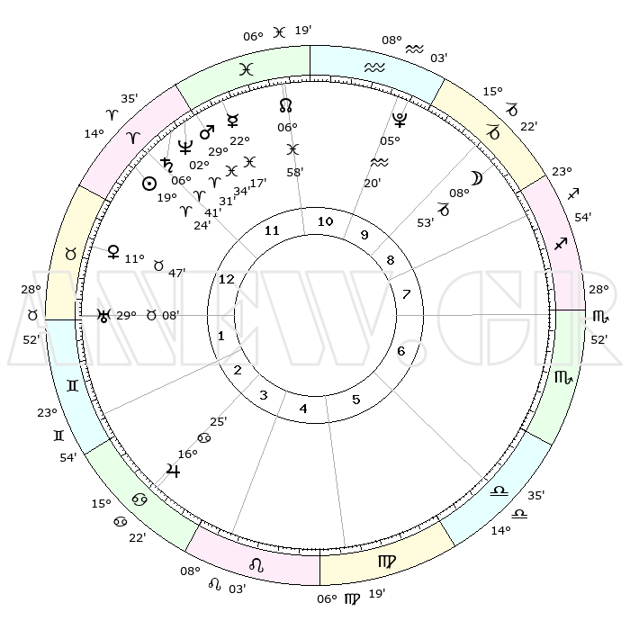 | | ΘΕΣΕΙΣ ΠΛΑΝΗΤΩΝ ΑΣΤΡΟΛΟΓΙΚΟΥ ΧΑΡΤΗ ΤΗΣ ΣΤΙΓΜΗΣ ΑΥΤΗΣ | | | | Πλανήτης | Ζώδιο | Μοίρες | Δεκαήμ. | Σε οίκο | Απόκλιση | | Ακμές των οίκων | | Ηλιος | Κριός | 19°21' | Δεύτερο | 12 | 07 N 34 | | 1ος | 27°42' | Κριός | | Σελήνη | Αιγόκερως | 08°07' | Πρώτο | 9 | 27 S 39 | | 2ος | 00°33' | Δίδυμοι | | Ερμής | Ιχθείς | 22°12' | Τρίτο | 12 | 05 S 11 | | 3ος | 24°21' | Δίδυμοι | | Αφροδίτη | Ταύρος | 11°42' | Δεύτερο | 1 | 15 N 15 | | 4ος | 16°02' | Καρκίνος | | Αρης | Ιχθείς | 29°31' | Τρίτο | 12 | 01 S 07 | | 5ος | 10°13' | Λέων | | Δίας | Καρκίνος | 16°25' | Δεύτερο | 4 | 22 N 48 | | 6ος | 12°29' | Παρθένος | | Κρόνος | Κριός | 06°41' | Πρώτο | 12 | 00 N 41 | | 7ος | 27°42' | Ζυγός | | Ουρανός | Ταύρος | 29°08' | Τρίτο | 1 | 19 N 48 | | 8ος | 00°33' | Τοξότης | | Ποσειδώνας | Κριός | 02°31' | Πρώτο | 12 | 00 S 12 | | 9ος | 24°21' | Τοξότης | | Πλούτωνας | Υδροχόος | 05°20' | Πρώτο | 10 | 22 S 47 | | 10ος | 16°02' | Αιγόκερως | | Β. Δεσμός | Ιχθείς | 06°58' | Πρώτο | 11 | 08 S 57 | | 11ος | 10°13' | Υδροχόος | | Ωροσκόπος | Κριός | 27°42' | Τρίτο | | | 12ος | 12°29' | Ιχθείς | | Μεσουράνημα | Αιγόκερως | 16°02' | Δεύτερο | | | |