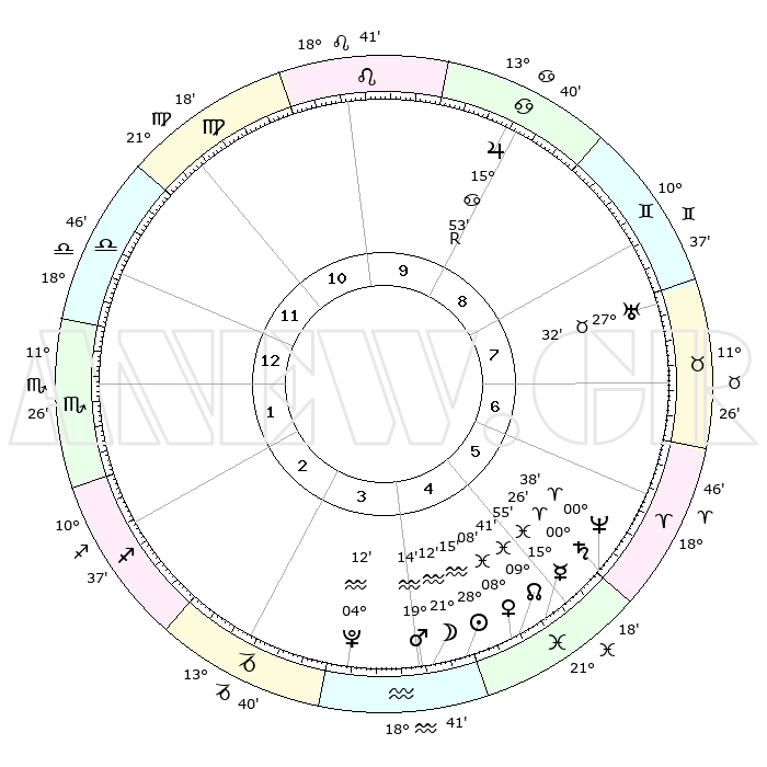 | | ΘΕΣΕΙΣ ΠΛΑΝΗΤΩΝ ΑΣΤΡΟΛΟΓΙΚΟΥ ΧΑΡΤΗ ΤΗΣ ΣΤΙΓΜΗΣ ΑΥΤΗΣ | | | | Πλανήτης | Ζώδιο | Μοίρες | Δεκαήμ. | Σε οίκο | Απόκλιση | | Ακμές των οίκων | | Ηλιος | Υδροχόος | 28°14' | Τρίτο | 4 | 12 S 05 | | 1ος | 07°49' | Σκορπιός | | Σελήνη | Υδροχόος | 21°02' | Τρίτο | 4 | 16 S 01 | | 2ος | 06°44' | Τοξότης | | Ερμής | Ιχθείς | 15°54' | Δεύτερο | 4 | 05 S 07 | | 3ος | 09°23' | Αιγόκερως | | Αφροδίτη | Ιχθείς | 08°07' | Πρώτο | 4 | 09 S 53 | | 4ος | 14°08' | Υδροχόος | | Αρης | Υδροχόος | 19°14' | Δεύτερο | 4 | 16 S 05 | | 5ος | 16°53' | Ιχθείς | | Δίας | Καρκίνος | 15°53'R | Δεύτερο | 9 | 22 N 49 | | 6ος | 14°47' | Κριός | | Κρόνος | Κριός | 00°26' | Πρώτο | 5 | 01 S 48 | | 7ος | 07°49' | Ταύρος | | Ουρανός | Ταύρος | 27°32' | Τρίτο | 7 | 19 N 26 | | 8ος | 06°44' | Δίδυμοι | | Ποσειδώνας | Κριός | 00°38' | Πρώτο | 5 | 00 S 57 | | 9ος | 09°23' | Καρκίνος | | Πλούτωνας | Υδροχόος | 04°12' | Πρώτο | 3 | 22 S 56 | | 10ος | 14°08' | Λέων | | Β. Δεσμός | Ιχθείς | 09°41' | Πρώτο | 4 | 07 S 56 | | 11ος | 16°53' | Παρθένος | | Ωροσκόπος | Σκορπιός | 07°49' | Πρώτο | | | 12ος | 14°47' | Ζυγός | | Μεσουράνημα | Λέων | 14°08' | Δεύτερο | | | |