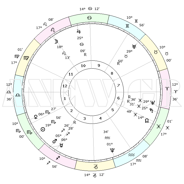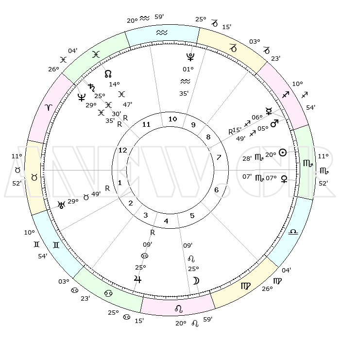 | | ΘΕΣΕΙΣ ΠΛΑΝΗΤΩΝ ΑΣΤΡΟΛΟΓΙΚΟΥ ΧΑΡΤΗ ΤΗΣ ΣΤΙΓΜΗΣ ΑΥΤΗΣ | | | | Πλανήτης | Ζώδιο | Μοίρες | Δεκαήμ. | Σε οίκο | Απόκλιση | | Ακμές των οίκων | | Ηλιος | Σκορπιός | 19°52' | Δεύτερο | 3 | 17 S 42 | | 1ος | 22°32' | Παρθένος | | Σελήνη | Λέων | 17°19' | Δεύτερο | 11 | 17 N 59 | | 2ος | 18°32' | Ζυγός | | Ερμής | Τοξότης | 06°29'R | Πρώτο | 3 | 23 S 19 | | 3ος | 18°40' | Σκορπιός | | Αφροδίτη | Σκορπιός | 06°22' | Πρώτο | 2 | 12 S 26 | | 4ος | 21°36' | Τοξότης | | Αρης | Τοξότης | 05°23' | Πρώτο | 3 | 21 S 41 | | 5ος | 24°43' | Αιγόκερως | | Δίας | Καρκίνος | 25°09'R | Τρίτο | 11 | 21 N 12 | | 6ος | 25°26' | Υδροχόος | | Κρόνος | Ιχθείς | 25°31'R | Τρίτο | 7 | 04 S 01 | | 7ος | 22°32' | Ιχθείς | | Ουρανός | Ταύρος | 29°50'R | Τρίτο | 9 | 19 N 54 | | 8ος | 18°32' | Κριός | | Ποσειδώνας | Ιχθείς | 29°36'R | Τρίτο | 7 | 01 S 25 | | 9ος | 18°40' | Ταύρος | | Πλούτωνας | Υδροχόος | 01°34' | Πρώτο | 5 | 23 S 29 | | 10ος | 21°36' | Δίδυμοι | | Β. Δεσμός | Ιχθείς | 14°49' | Δεύτερο | 6 | 05 S 59 | | 11ος | 24°43' | Καρκίνος | | Ωροσκόπος | Παρθένος | 22°32' | Τρίτο | | | 12ος | 25°26' | Λέων | | Μεσουράνημα | Δίδυμοι | 21°36' | Τρίτο | | | |