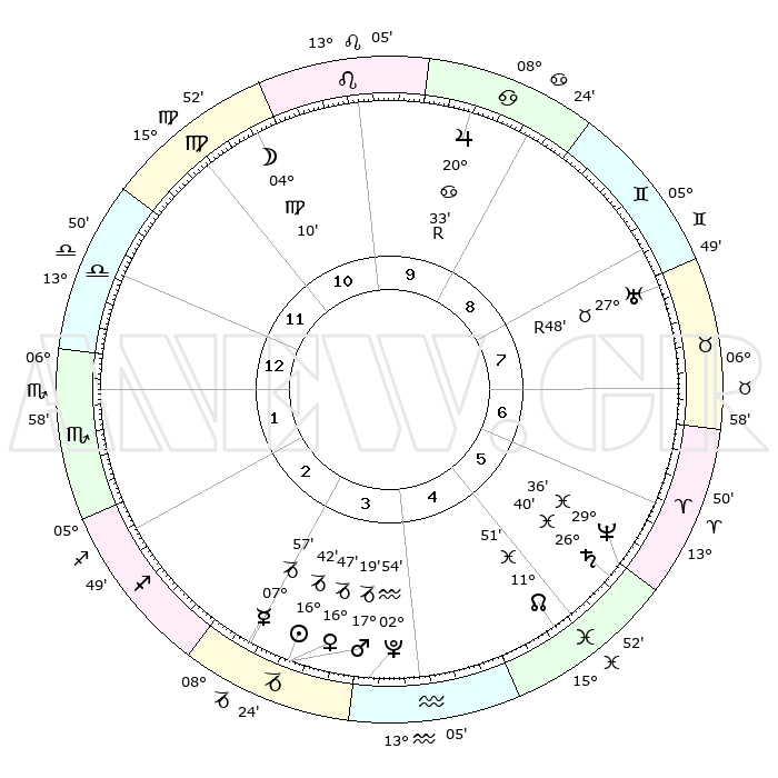 | | ΘΕΣΕΙΣ ΠΛΑΝΗΤΩΝ ΑΣΤΡΟΛΟΓΙΚΟΥ ΧΑΡΤΗ ΤΗΣ ΣΤΙΓΜΗΣ ΑΥΤΗΣ | | | | Πλανήτης | Ζώδιο | Μοίρες | Δεκαήμ. | Σε οίκο | Απόκλιση | | Ακμές των οίκων | | Ηλιος | Αιγόκερως | 17°12' | Δεύτερο | 8 | 22 S 20 | | 1ος | 04°28' | Δίδυμοι | | Σελήνη | Παρθένος | 10°48' | Δεύτερο | 4 | 07 N 28 | | 2ος | 28°25' | Δίδυμοι | | Ερμής | Αιγόκερως | 08°44' | Πρώτο | 8 | 24 S 22 | | 3ος | 19°42' | Καρκίνος | | Αφροδίτη | Αιγόκερως | 17°25' | Δεύτερο | 8 | 23 S 02 | | 4ος | 12°50' | Λέων | | Αρης | Αιγόκερως | 17°42' | Δεύτερο | 8 | 23 S 11 | | 5ος | 12°05' | Παρθένος | | Δίας | Καρκίνος | 20°29'R | Τρίτο | 3 | 22 N 07 | | 6ος | 21°11' | Ζυγός | | Κρόνος | Ιχθείς | 26°42' | Τρίτο | 11 | 03 S 22 | | 7ος | 04°28' | Τοξότης | | Ουρανός | Ταύρος | 27°47'R | Τρίτο | 12 | 19 N 28 | | 8ος | 28°25' | Τοξότης | | Ποσειδώνας | Ιχθείς | 29°36' | Τρίτο | 11 | 01 S 23 | | 9ος | 19°42' | Αιγόκερως | | Πλούτωνας | Υδροχόος | 02°55' | Πρώτο | 9 | 23 S 11 | | 10ος | 12°50' | Υδροχόος | | Β. Δεσμός | Ιχθείς | 11°49' | Δεύτερο | 10 | 07 S 08 | | 11ος | 12°05' | Ιχθείς | | Ωροσκόπος | Δίδυμοι | 04°28' | Πρώτο | | | 12ος | 21°11' | Κριός | | Μεσουράνημα | Υδροχόος | 12°50' | Δεύτερο | | | |