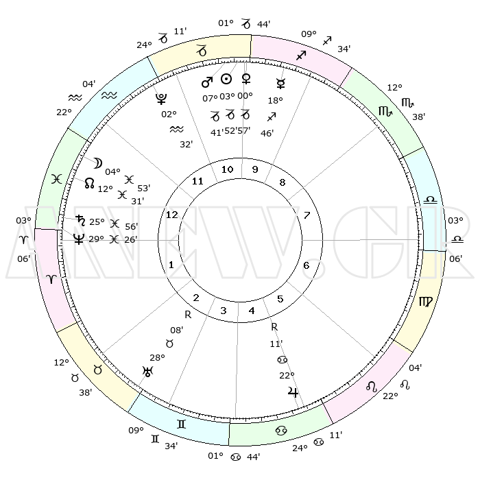 | | ΘΕΣΕΙΣ ΠΛΑΝΗΤΩΝ ΑΣΤΡΟΛΟΓΙΚΟΥ ΧΑΡΤΗ ΤΗΣ ΣΤΙΓΜΗΣ ΑΥΤΗΣ | | | | Πλανήτης | Ζώδιο | Μοίρες | Δεκαήμ. | Σε οίκο | Απόκλιση | | Ακμές των οίκων | | Ηλιος | Αιγόκερως | 02°32' | Πρώτο | 2 | 23 S 24 | | 1ος | 23°02' | Σκορπιός | | Σελήνη | Υδροχόος | 18°04' | Δεύτερο | 3 | 17 S 19 | | 2ος | 23°18' | Τοξότης | | Ερμής | Τοξότης | 16°49' | Δεύτερο | 1 | 22 S 25 | | 3ος | 27°54' | Αιγόκερως | | Αφροδίτη | Τοξότης | 29°17' | Τρίτο | 2 | 23 S 38 | | 4ος | 03°41' | Ιχθείς | | Αρης | Αιγόκερως | 06°40' | Πρώτο | 2 | 24 S 06 | | 5ος | 05°29' | Κριός | | Δίας | Καρκίνος | 22°21'R | Τρίτο | 8 | 21 N 48 | | 6ος | 01°29' | Ταύρος | | Κρόνος | Ιχθείς | 25°53' | Τρίτο | 4 | 03 S 44 | | 7ος | 23°02' | Ταύρος | | Ουρανός | Ταύρος | 28°11'R | Τρίτο | 7 | 19 N 33 | | 8ος | 23°18' | Δίδυμοι | | Ποσειδώνας | Ιχθείς | 29°26' | Τρίτο | 4 | 01 S 27 | | 9ος | 27°54' | Καρκίνος | | Πλούτωνας | Υδροχόος | 02°29' | Πρώτο | 3 | 23 S 16 | | 10ος | 03°41' | Παρθένος | | Β. Δεσμός | Ιχθείς | 12°35' | Δεύτερο | 4 | 06 S 50 | | 11ος | 05°29' | Ζυγός | | Ωροσκόπος | Σκορπιός | 23°02' | Τρίτο | | | 12ος | 01°29' | Σκορπιός | | Μεσουράνημα | Παρθένος | 03°41' | Πρώτο | | | |