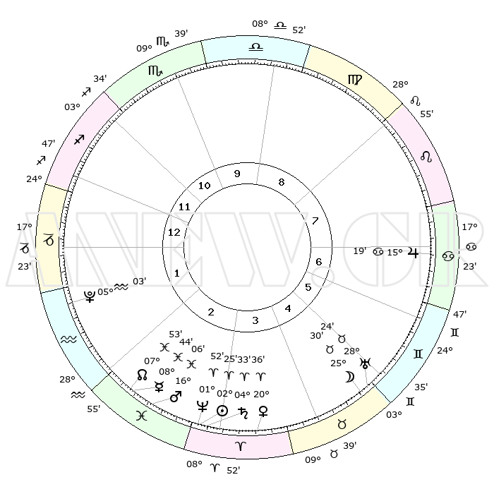 | | ΘΕΣΕΙΣ ΠΛΑΝΗΤΩΝ ΑΣΤΡΟΛΟΓΙΚΟΥ ΧΑΡΤΗ ΤΗΣ ΣΤΙΓΜΗΣ ΑΥΤΗΣ | | | | Πλανήτης | Ζώδιο | Μοίρες | Δεκαήμ. | Σε οίκο | Απόκλιση | | Ακμές των οίκων | | Ηλιος | Κριός | 02°36' | Πρώτο | 12 | 01 N 02 | | 1ος | 22°23' | Κριός | | Σελήνη | Ταύρος | 28°11' | Τρίτο | 2 | 24 N 46 | | 2ος | 26°43' | Ταύρος | | Ερμής | Ιχθείς | 08°46' | Πρώτο | 12 | 07 S 54 | | 3ος | 21°07' | Δίδυμοι | | Αφροδίτη | Κριός | 20°49' | Τρίτο | 12 | 07 N 24 | | 4ος | 12°49' | Καρκίνος | | Αρης | Ιχθείς | 16°15' | Δεύτερο | 12 | 06 S 25 | | 5ος | 06°32' | Λέων | | Δίας | Καρκίνος | 15°19' | Δεύτερο | 4 | 22 N 55 | | 6ος | 07°46' | Παρθένος | | Κρόνος | Κριός | 04°34' | Πρώτο | 12 | 00 S 08 | | 7ος | 22°23' | Ζυγός | | Ουρανός | Ταύρος | 28°24' | Τρίτο | 2 | 19 N 38 | | 8ος | 26°43' | Σκορπιός | | Ποσειδώνας | Κριός | 01°53' | Πρώτο | 12 | 00 S 27 | | 9ος | 21°07' | Τοξότης | | Πλούτωνας | Υδροχόος | 05°04' | Πρώτο | 10 | 22 S 48 | | 10ος | 12°49' | Αιγόκερως | | Β. Δεσμός | Ιχθείς | 07°52' | Πρώτο | 12 | 08 S 37 | | 11ος | 06°32' | Υδροχόος | | Ωροσκόπος | Κριός | 22°23' | Τρίτο | | | 12ος | 07°46' | Ιχθείς | | Μεσουράνημα | Αιγόκερως | 12°49' | Δεύτερο | | | |