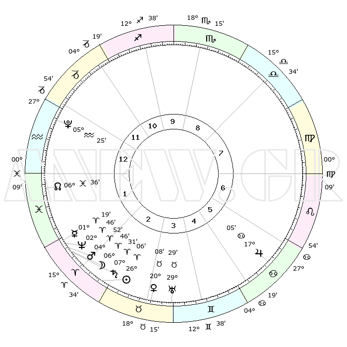 | | ΘΕΣΕΙΣ ΠΛΑΝΗΤΩΝ ΑΣΤΡΟΛΟΓΙΚΟΥ ΧΑΡΤΗ ΤΗΣ ΣΤΙΓΜΗΣ ΑΥΤΗΣ | | | | Πλανήτης | Ζώδιο | Μοίρες | Δεκαήμ. | Σε οίκο | Απόκλιση | | Ακμές των οίκων | | Ηλιος | Κριός | 26°02' | Τρίτο | 3 | 10 N 03 | | 1ος | 00°03' | Υδροχόος | | Σελήνη | Κριός | 05°52' | Πρώτο | 2 | 04 N 32 | | 2ος | 14°09' | Ιχθείς | | Ερμής | Κριός | 01°14' | Πρώτο | 2 | 01 S 55 | | 3ος | 22°35' | Κριός | | Αφροδίτη | Ταύρος | 20°03' | Τρίτο | 3 | 17 N 58 | | 4ος | 21°03' | Ταύρος | | Αρης | Κριός | 04°49' | Πρώτο | 2 | 01 N 01 | | 5ος | 13°48' | Δίδυμοι | | Δίας | Καρκίνος | 17°04' | Δεύτερο | 6 | 22 N 43 | | 6ος | 05°14' | Καρκίνος | | Κρόνος | Κριός | 07°30' | Πρώτο | 2 | 01 N 00 | | 7ος | 00°03' | Λέων | | Ουρανός | Ταύρος | 29°29' | Τρίτο | 4 | 19 N 52 | | 8ος | 14°09' | Παρθένος | | Ποσειδώνας | Κριός | 02°46' | Πρώτο | 2 | 00 S 06 | | 9ος | 22°35' | Ζυγός | | Πλούτωνας | Υδροχόος | 05°25' | Πρώτο | 1 | 22 S 47 | | 10ος | 21°03' | Σκορπιός | | Β. Δεσμός | Ιχθείς | 06°37' | Πρώτο | 1 | 09 S 05 | | 11ος | 13°48' | Τοξότης | | Ωροσκόπος | Υδροχόος | 00°03' | Πρώτο | | | 12ος | 05°14' | Αιγόκερως | | Μεσουράνημα | Σκορπιός | 21°03' | Τρίτο | | | |