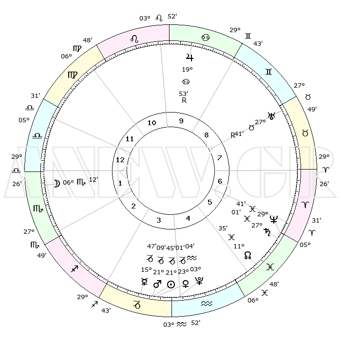 | | ΘΕΣΕΙΣ ΠΛΑΝΗΤΩΝ ΑΣΤΡΟΛΟΓΙΚΟΥ ΧΑΡΤΗ ΤΗΣ ΣΤΙΓΜΗΣ ΑΥΤΗΣ | | | | Πλανήτης | Ζώδιο | Μοίρες | Δεκαήμ. | Σε οίκο | Απόκλιση | | Ακμές των οίκων | | Ηλιος | Αιγόκερως | 21°36' | Τρίτο | 5 | 21 S 42 | | 1ος | 15°08' | Παρθένος | | Σελήνη | Σκορπιός | 04°25' | Πρώτο | 2 | 16 S 54 | | 2ος | 10°30' | Ζυγός | | Ερμής | Αιγόκερως | 15°32' | Δεύτερο | 4 | 24 S 06 | | 3ος | 10°16' | Σκορπιός | | Αφροδίτη | Αιγόκερως | 22°50' | Τρίτο | 5 | 22 S 22 | | 4ος | 13°12' | Τοξότης | | Αρης | Αιγόκερως | 21°02' | Τρίτο | 5 | 22 S 44 | | 5ος | 16°34' | Αιγόκερως | | Δίας | Καρκίνος | 19°54'R | Δεύτερο | 11 | 22 N 13 | | 6ος | 17°36' | Υδροχόος | | Κρόνος | Ιχθείς | 27°00' | Τρίτο | 7 | 03 S 14 | | 7ος | 15°08' | Ιχθείς | | Ουρανός | Ταύρος | 27°41'R | Τρίτο | 9 | 19 N 27 | | 8ος | 10°30' | Κριός | | Ποσειδώνας | Ιχθείς | 29°41' | Τρίτο | 7 | 01 S 21 | | 9ος | 10°16' | Ταύρος | | Πλούτωνας | Υδροχόος | 03°03' | Πρώτο | 5 | 23 S 09 | | 10ος | 13°12' | Δίδυμοι | | Β. Δεσμός | Ιχθείς | 11°36' | Δεύτερο | 6 | 07 S 13 | | 11ος | 16°34' | Καρκίνος | | Ωροσκόπος | Παρθένος | 15°08' | Δεύτερο | | | 12ος | 17°36' | Λέων | | Μεσουράνημα | Δίδυμοι | 13°12' | Δεύτερο | | | |