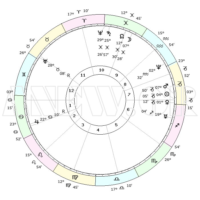 | | ΘΕΣΕΙΣ ΠΛΑΝΗΤΩΝ ΑΣΤΡΟΛΟΓΙΚΟΥ ΧΑΡΤΗ ΤΗΣ ΣΤΙΓΜΗΣ ΑΥΤΗΣ | | | | Πλανήτης | Ζώδιο | Μοίρες | Δεκαήμ. | Σε οίκο | Απόκλιση | | Ακμές των οίκων | | Ηλιος | Αιγόκερως | 03°60' | Πρώτο | 8 | 23 S 22 | | 1ος | 04°09' | Δίδυμοι | | Σελήνη | Ιχθείς | 06°26' | Πρώτο | 10 | 09 S 33 | | 2ος | 28°10' | Δίδυμοι | | Ερμής | Τοξότης | 18°57' | Δεύτερο | 7 | 22 S 47 | | 3ος | 19°27' | Καρκίνος | | Αφροδίτη | Αιγόκερως | 01°06' | Πρώτο | 8 | 23 S 41 | | 4ος | 12°33' | Λέων | | Αρης | Αιγόκερως | 07°46' | Πρώτο | 8 | 24 S 03 | | 5ος | 11°45' | Παρθένος | | Δίας | Καρκίνος | 22°10'R | Τρίτο | 3 | 21 N 50 | | 6ος | 20°48' | Ζυγός | | Κρόνος | Ιχθείς | 25°57' | Τρίτο | 11 | 03 S 42 | | 7ος | 04°09' | Τοξότης | | Ουρανός | Ταύρος | 28°08'R | Τρίτο | 12 | 19 N 33 | | 8ος | 28°10' | Τοξότης | | Ποσειδώνας | Ιχθείς | 29°26' | Τρίτο | 11 | 01 S 27 | | 9ος | 19°27' | Αιγόκερως | | Πλούτωνας | Υδροχόος | 02°32' | Πρώτο | 9 | 23 S 16 | | 10ος | 12°33' | Υδροχόος | | Β. Δεσμός | Ιχθείς | 12°31' | Δεύτερο | 11 | 06 S 52 | | 11ος | 11°45' | Ιχθείς | | Ωροσκόπος | Δίδυμοι | 04°09' | Πρώτο | | | 12ος | 20°48' | Κριός | | Μεσουράνημα | Υδροχόος | 12°33' | Δεύτερο | | | |