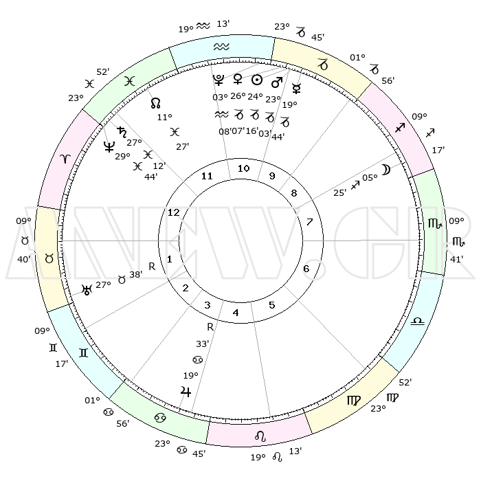 | | ΘΕΣΕΙΣ ΠΛΑΝΗΤΩΝ ΑΣΤΡΟΛΟΓΙΚΟΥ ΧΑΡΤΗ ΤΗΣ ΣΤΙΓΜΗΣ ΑΥΤΗΣ | | | | Πλανήτης | Ζώδιο | Μοίρες | Δεκαήμ. | Σε οίκο | Απόκλιση | | Ακμές των οίκων | | Ηλιος | Αιγόκερως | 24°12' | Τρίτο | 11 | 21 S 16 | | 1ος | 29°16' | Ιχθείς | | Σελήνη | Τοξότης | 04°34' | Πρώτο | 8 | 26 S 03 | | 2ος | 09°44' | Ταύρος | | Ερμής | Αιγόκερως | 19°37' | Δεύτερο | 10 | 23 S 44 | | 3ος | 07°15' | Δίδυμοι | | Αφροδίτη | Αιγόκερως | 26°02' | Τρίτο | 11 | 21 S 53 | | 4ος | 29°35' | Δίδυμοι | | Αρης | Αιγόκερως | 22°60' | Τρίτο | 11 | 22 S 26 | | 5ος | 21°51' | Καρκίνος | | Δίας | Καρκίνος | 19°34'R | Δεύτερο | 4 | 22 N 16 | | 6ος | 19°09' | Λέων | | Κρόνος | Ιχθείς | 27°12' | Τρίτο | 12 | 03 S 09 | | 7ος | 29°16' | Παρθένος | | Ουρανός | Ταύρος | 27°38'R | Τρίτο | 2 | 19 N 26 | | 8ος | 09°44' | Σκορπιός | | Ποσειδώνας | Ιχθείς | 29°43' | Τρίτο | 1 | 01 S 20 | | 9ος | 07°15' | Τοξότης | | Πλούτωνας | Υδροχόος | 03°08' | Πρώτο | 11 | 23 S 08 | | 10ος | 29°35' | Τοξότης | | Β. Δεσμός | Ιχθείς | 11°28' | Δεύτερο | 12 | 07 S 16 | | 11ος | 21°51' | Αιγόκερως | | Ωροσκόπος | Ιχθείς | 29°16' | Τρίτο | | | 12ος | 19°09' | Υδροχόος | | Μεσουράνημα | Τοξότης | 29°35' | Τρίτο | | | |