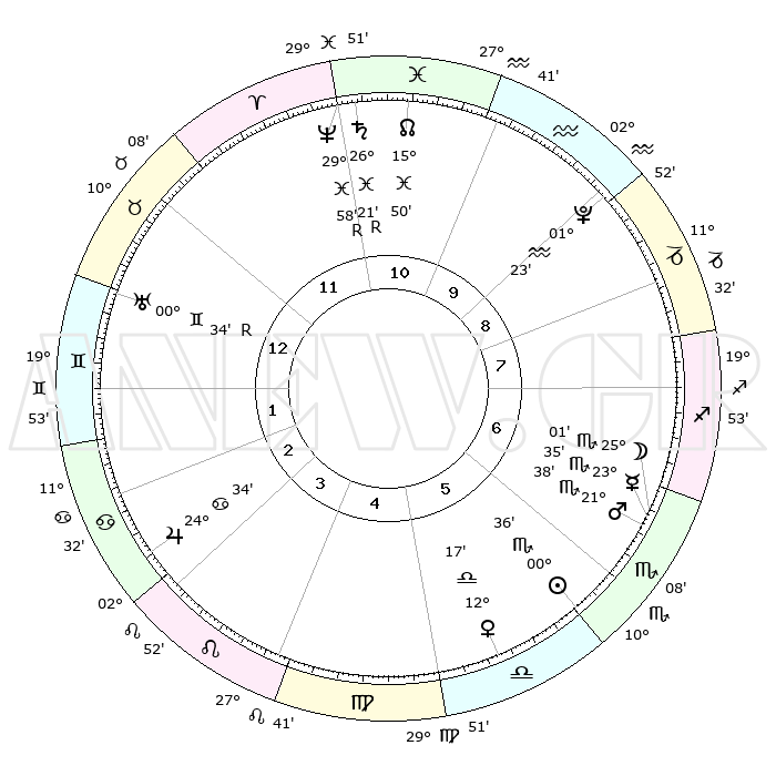 | ΘΕΣΕΙΣ ΠΛΑΝΗΤΩΝ ΑΣΤΡΟΛΟΓΙΚΟΥ ΧΑΡΤΗ ΤΗΣ ΣΤΙΓΜΗΣ ΑΥΤΗΣ | | Πλανήτης | Ζώδιο | Μοίρες | Δεκαήμ. | Σε οίκο | Απόκλιση | | Ακμές των οίκων | Ηλιος | Σκορπιός | 00°27' | Πρώτο | 7 | 11 S 38 | | 1ος | 08°32' | Κριός | Σελήνη | Σκορπιός | 23°14' | Τρίτο | 8 | 23 S 06 | | 2ος | 16°39' | Ταύρος | Ερμής | Σκορπιός | 23°24' | Τρίτο | 8 | 21 S 04 | | 3ος | 12°49' | Δίδυμοι | Αφροδίτη | Ζυγός | 12°06' | Δεύτερο | 7 | 03 S 22 | | 4ος | 04°48' | Καρκίνος | Αρης | Σκορπιός | 21°32' | Τρίτο | 8 | 18 S 26 | | 5ος | 27°32' | Καρκίνος | Δίας | Καρκίνος | 24°34' | Τρίτο | 4 | 21 N 16 | | 6ος | 26°18' | Λέων | Κρόνος | Ιχθείς | 26°21'R | Τρίτο | 12 | 03 S 44 | | 7ος | 08°32' | Ζυγός | Ουρανός | Δίδυμοι | 00°35'R | Πρώτο | 2 | 20 N 04 | | 8ος | 16°39' | Σκορπιός | Ποσειδώνας | Ιχθείς | 29°58'R | Τρίτο | 12 | 01 S 16 | | 9ος | 12°49' | Τοξότης | Πλούτωνας | Υδροχόος | 01°23' | Πρώτο | 11 | 23 S 32 | | 10ος | 04°48' | Αιγόκερως | Β. Δεσμός | Ιχθείς | 15°51' | Δεύτερο | 12 | 05 S 35 | | 11ος | 27°32' | Αιγόκερως | Ωροσκόπος | Κριός | 08°32' | Πρώτο | | | 12ος | 26°18' | Υδροχόος | Μεσουράνημα | Αιγόκερως | 04°48' | Πρώτο | | | |