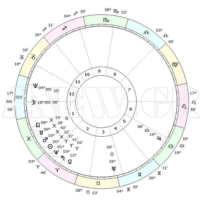 | | ΘΕΣΕΙΣ ΠΛΑΝΗΤΩΝ ΑΣΤΡΟΛΟΓΙΚΟΥ ΧΑΡΤΗ ΤΗΣ ΣΤΙΓΜΗΣ ΑΥΤΗΣ | | | | Πλανήτης | Ζώδιο | Μοίρες | Δεκαήμ. | Σε οίκο | Απόκλιση | | Ακμές των οίκων | | Ηλιος | Ιχθείς | 25°29' | Τρίτο | 2 | 01 S 48 | | 1ος | 24°36' | Αιγόκερως | | Σελήνη | Υδροχόος | 18°16' | Δεύτερο | 1 | 17 S 08 | | 2ος | 07°42' | Ιχθείς | | Ερμής | Ιχθείς | 09°39'R | Πρώτο | 2 | 05 S 57 | | 3ος | 16°55' | Κριός | | Αφροδίτη | Κριός | 11°58' | Δεύτερο | 2 | 03 N 48 | | 4ος | 16°21' | Ταύρος | | Αρης | Ιχθείς | 10°38' | Δεύτερο | 2 | 08 S 35 | | 5ος | 09°33' | Δίδυμοι | | Δίας | Καρκίνος | 15°08' | Δεύτερο | 6 | 22 N 56 | | 6ος | 00°49' | Καρκίνος | | Κρόνος | Κριός | 03°41' | Πρώτο | 2 | 00 S 29 | | 7ος | 24°36' | Καρκίνος | | Ουρανός | Ταύρος | 28°09' | Τρίτο | 4 | 19 N 34 | | 8ος | 07°42' | Παρθένος | | Ποσειδώνας | Κριός | 01°36' | Πρώτο | 2 | 00 S 34 | | 9ος | 16°55' | Ζυγός | | Πλούτωνας | Υδροχόος | 04°55' | Πρώτο | 1 | 22 S 49 | | 10ος | 16°21' | Σκορπιός | | Β. Δεσμός | Ιχθείς | 08°15' | Πρώτο | 2 | 08 S 29 | | 11ος | 09°33' | Τοξότης | | Ωροσκόπος | Αιγόκερως | 24°36' | Τρίτο | | | 12ος | 00°49' | Αιγόκερως | | Μεσουράνημα | Σκορπιός | 16°21' | Δεύτερο | | | |