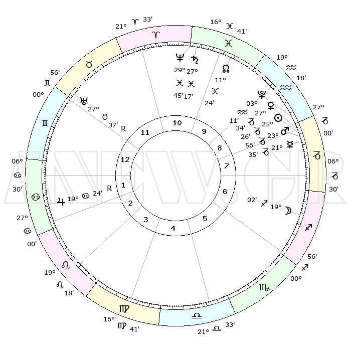 | | ΘΕΣΕΙΣ ΠΛΑΝΗΤΩΝ ΑΣΤΡΟΛΟΓΙΚΟΥ ΧΑΡΤΗ ΤΗΣ ΣΤΙΓΜΗΣ ΑΥΤΗΣ | | | | Πλανήτης | Ζώδιο | Μοίρες | Δεκαήμ. | Σε οίκο | Απόκλιση | | Ακμές των οίκων | | Ηλιος | Αιγόκερως | 25°22' | Τρίτο | 8 | 21 S 04 | | 1ος | 14°53' | Δίδυμοι | | Σελήνη | Τοξότης | 18°16' | Δεύτερο | 7 | 27 S 58 | | 2ος | 07°10' | Καρκίνος | | Ερμής | Αιγόκερως | 21°29' | Τρίτο | 8 | 23 S 31 | | 3ος | 28°23' | Καρκίνος | | Αφροδίτη | Αιγόκερως | 27°29' | Τρίτο | 8 | 21 S 38 | | 4ος | 22°35' | Λέων | | Αρης | Αιγόκερως | 23°54' | Τρίτο | 8 | 22 S 17 | | 5ος | 23°47' | Παρθένος | | Δίας | Καρκίνος | 19°25'R | Δεύτερο | 2 | 22 N 18 | | 6ος | 03°54' | Σκορπιός | | Κρόνος | Ιχθείς | 27°17' | Τρίτο | 11 | 03 S 07 | | 7ος | 14°53' | Τοξότης | | Ουρανός | Ταύρος | 27°37'R | Τρίτο | 12 | 19 N 26 | | 8ος | 07°10' | Αιγόκερως | | Ποσειδώνας | Ιχθείς | 29°45' | Τρίτο | 11 | 01 S 19 | | 9ος | 28°23' | Αιγόκερως | | Πλούτωνας | Υδροχόος | 03°10' | Πρώτο | 9 | 23 S 08 | | 10ος | 22°35' | Υδροχόος | | Β. Δεσμός | Ιχθείς | 11°24' | Δεύτερο | 10 | 07 S 17 | | 11ος | 23°47' | Ιχθείς | | Ωροσκόπος | Δίδυμοι | 14°53' | Δεύτερο | | | 12ος | 03°54' | Ταύρος | | Μεσουράνημα | Υδροχόος | 22°35' | Τρίτο | | | |