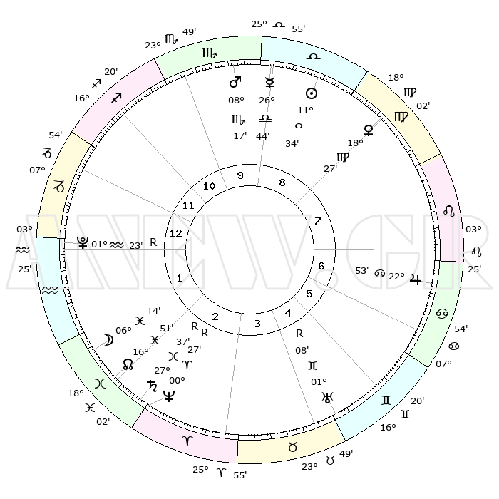 | ΘΕΣΕΙΣ ΠΛΑΝΗΤΩΝ ΑΣΤΡΟΛΟΓΙΚΟΥ ΧΑΡΤΗ ΤΗΣ ΣΤΙΓΜΗΣ ΑΥΤΗΣ | | Πλανήτης | Ζώδιο | Μοίρες | Δεκαήμ. | Σε οίκο | Απόκλιση | | Ακμές των οίκων | Ηλιος | Ζυγός | 11°27' | Δεύτερο | 9 | 04 S 32 | | 1ος | 22°54' | Τοξότης | Σελήνη | Ιχθείς | 04°42' | Πρώτο | 2 | 10 S 56 | | 2ος | 28°19' | Αιγόκερως | Ερμής | Ζυγός | 26°34' | Τρίτο | 10 | 10 S 43 | | 3ος | 07°38' | Ιχθείς | Αφροδίτη | Παρθένος | 18°18' | Δεύτερο | 9 | 05 N 53 | | 4ος | 12°35' | Κριός | Αρης | Σκορπιός | 08°13' | Πρώτο | 10 | 14 S 21 | | 5ος | 10°04' | Ταύρος | Δίας | Καρκίνος | 22°52' | Τρίτο | 7 | 21 N 31 | | 6ος | 02°25' | Δίδυμοι | Κρόνος | Ιχθείς | 27°38'R | Τρίτο | 3 | 03 S 15 | | 7ος | 22°54' | Δίδυμοι | Ουρανός | Δίδυμοι | 01°08'R | Πρώτο | 5 | 20 N 10 | | 8ος | 28°19' | Καρκίνος | Ποσειδώνας | Κριός | 00°27'R | Πρώτο | 3 | 01 S 05 | | 9ος | 07°38' | Παρθένος | Πλούτωνας | Υδροχόος | 01°23'R | Πρώτο | 2 | 23 S 32 | | 10ος | 12°35' | Ζυγός | Β. Δεσμός | Ιχθείς | 16°52' | Δεύτερο | 3 | 05 S 11 | | 11ος | 10°04' | Σκορπιός | Ωροσκόπος | Τοξότης | 22°54' | Τρίτο | | | 12ος | 02°25' | Τοξότης | Μεσουράνημα | Ζυγός | 12°35' | Δεύτερο | | | |