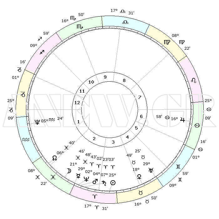 | | ΘΕΣΕΙΣ ΠΛΑΝΗΤΩΝ ΑΣΤΡΟΛΟΓΙΚΟΥ ΧΑΡΤΗ ΤΗΣ ΣΤΙΓΜΗΣ ΑΥΤΗΣ | | | | Πλανήτης | Ζώδιο | Μοίρες | Δεκαήμ. | Σε οίκο | Απόκλιση | | Ακμές των οίκων | | Ηλιος | Κριός | 24°59' | Τρίτο | 4 | 09 N 40 | | 1ος | 02°37' | Αιγόκερως | | Σελήνη | Ιχθείς | 20°54' | Τρίτο | 3 | 02 S 33 | | 2ος | 10°26' | Υδροχόος | | Ερμής | Ιχθείς | 29°43' | Τρίτο | 3 | 02 S 29 | | 3ος | 20°35' | Ιχθείς | | Αφροδίτη | Ταύρος | 18°45' | Δεύτερο | 4 | 17 N 33 | | 4ος | 24°06' | Κριός | | Αρης | Κριός | 03°59' | Πρώτο | 3 | 00 N 41 | | 5ος | 20°00' | Ταύρος | | Δίας | Καρκίνος | 16°58' | Δεύτερο | 7 | 22 N 44 | | 6ος | 11°39' | Δίδυμοι | | Κρόνος | Κριός | 07°23' | Πρώτο | 3 | 00 N 57 | | 7ος | 02°37' | Καρκίνος | | Ουρανός | Ταύρος | 29°25' | Τρίτο | 5 | 19 N 51 | | 8ος | 10°26' | Λέων | | Ποσειδώνας | Κριός | 02°43' | Πρώτο | 3 | 00 S 07 | | 9ος | 20°35' | Παρθένος | | Πλούτωνας | Υδροχόος | 05°24' | Πρώτο | 1 | 22 S 47 | | 10ος | 24°06' | Ζυγός | | Β. Δεσμός | Ιχθείς | 06°40' | Πρώτο | 2 | 09 S 04 | | 11ος | 20°00' | Σκορπιός | | Ωροσκόπος | Αιγόκερως | 02°37' | Πρώτο | | | 12ος | 11°39' | Τοξότης | | Μεσουράνημα | Ζυγός | 24°06' | Τρίτο | | | |