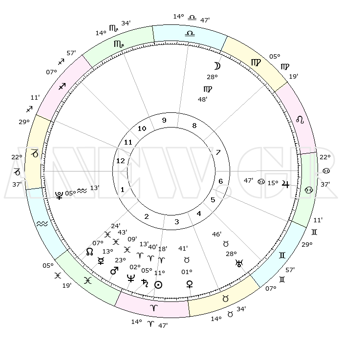| | ΘΕΣΕΙΣ ΠΛΑΝΗΤΩΝ ΑΣΤΡΟΛΟΓΙΚΟΥ ΧΑΡΤΗ ΤΗΣ ΣΤΙΓΜΗΣ ΑΥΤΗΣ | | | | Πλανήτης | Ζώδιο | Μοίρες | Δεκαήμ. | Σε οίκο | Απόκλιση | | Ακμές των οίκων | | Ηλιος | Κριός | 11°15' | Δεύτερο | 3 | 04 N 27 | | 1ος | 00°59' | Αιγόκερως | | Σελήνη | Παρθένος | 28°02' | Τρίτο | 9 | 00 S 48 | | 2ος | 08°22' | Υδροχόος | | Ερμής | Ιχθείς | 13°40' | Δεύτερο | 2 | 07 S 37 | | 3ος | 18°26' | Ιχθείς | | Αφροδίτη | Ταύρος | 01°37' | Πρώτο | 4 | 11 N 37 | | 4ος | 22°13' | Κριός | | Αρης | Ιχθείς | 23°06' | Τρίτο | 3 | 03 S 42 | | 5ος | 18°23' | Ταύρος | | Δίας | Καρκίνος | 15°47' | Δεύτερο | 7 | 22 N 52 | | 6ος | 10°07' | Δίδυμοι | | Κρόνος | Κριός | 05°39' | Πρώτο | 3 | 00 N 17 | | 7ος | 00°58' | Καρκίνος | | Ουρανός | Ταύρος | 28°46' | Τρίτο | 5 | 19 N 43 | | 8ος | 08°22' | Λέων | | Ποσειδώνας | Κριός | 02°12' | Πρώτο | 3 | 00 S 19 | | 9ος | 18°26' | Παρθένος | | Πλούτωνας | Υδροχόος | 05°13' | Πρώτο | 1 | 22 S 47 | | 10ος | 22°13' | Ζυγός | | Β. Δεσμός | Ιχθείς | 07°24' | Πρώτο | 2 | 08 S 47 | | 11ος | 18°23' | Σκορπιός | | Ωροσκόπος | Αιγόκερως | 00°59' | Πρώτο | | | 12ος | 10°07' | Τοξότης | | Μεσουράνημα | Ζυγός | 22°13' | Τρίτο | | | |