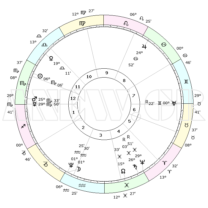 | | ΘΕΣΕΙΣ ΠΛΑΝΗΤΩΝ ΑΣΤΡΟΛΟΓΙΚΟΥ ΧΑΡΤΗ ΤΗΣ ΣΤΙΓΜΗΣ ΑΥΤΗΣ | | | | Πλανήτης | Ζώδιο | Μοίρες | Δεκαήμ. | Σε οίκο | Απόκλιση | | Ακμές των οίκων | | Ηλιος | Σκορπιός | 05°43' | Πρώτο | 4 | 13 S 25 | | 1ος | 04°58' | Λέων | | Σελήνη | Αιγόκερως | 26°37' | Τρίτο | 6 | 24 S 43 | | 2ος | 26°22' | Λέων | | Ερμής | Σκορπιός | 29°25' | Τρίτο | 4 | 22 S 47 | | 3ος | 22°06' | Παρθένος | | Αφροδίτη | Ζυγός | 18°42' | Δεύτερο | 3 | 05 S 56 | | 4ος | 23°42' | Ζυγός | | Αρης | Σκορπιός | 25°16' | Τρίτο | 4 | 19 S 26 | | 5ος | 29°34' | Σκορπιός | | Δίας | Καρκίνος | 24°50' | Τρίτο | 12 | 21 N 14 | | 6ος | 04°29' | Αιγόκερως | | Κρόνος | Ιχθείς | 26°04'R | Τρίτο | 9 | 03 S 50 | | 7ος | 04°58' | Υδροχόος | | Ουρανός | Δίδυμοι | 00°23'R | Πρώτο | 11 | 20 N 01 | | 8ος | 26°22' | Υδροχόος | | Ποσειδώνας | Ιχθείς | 29°51'R | Τρίτο | 9 | 01 S 19 | | 9ος | 22°06' | Ιχθείς | | Πλούτωνας | Υδροχόος | 01°25' | Πρώτο | 6 | 23 S 31 | | 10ος | 23°42' | Κριός | | Β. Δεσμός | Ιχθείς | 15°34' | Δεύτερο | 8 | 05 S 41 | | 11ος | 29°34' | Ταύρος | | Ωροσκόπος | Λέων | 04°58' | Πρώτο | | | 12ος | 04°28' | Καρκίνος | | Μεσουράνημα | Κριός | 23°42' | Τρίτο | | | |