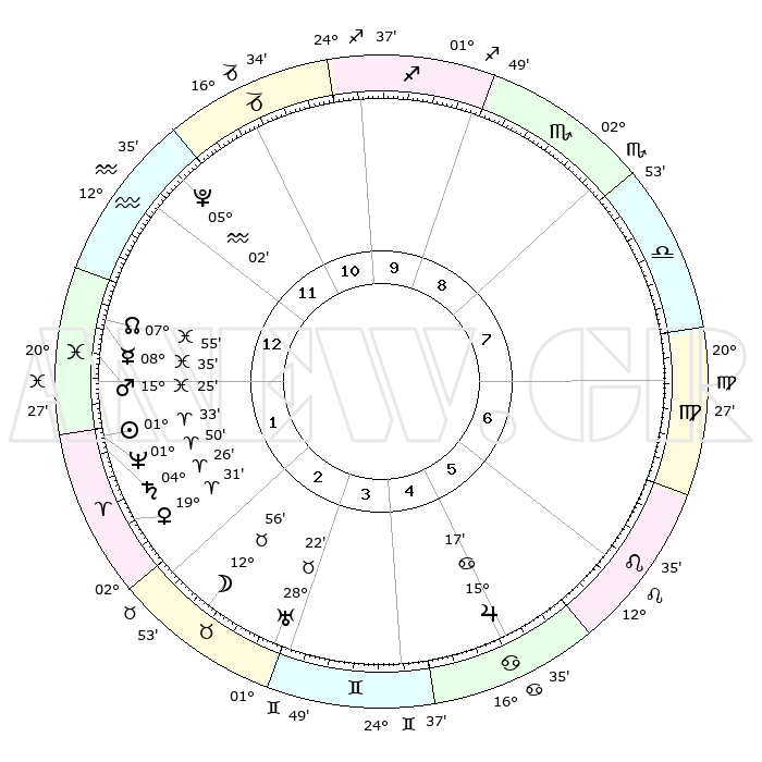 | | ΘΕΣΕΙΣ ΠΛΑΝΗΤΩΝ ΑΣΤΡΟΛΟΓΙΚΟΥ ΧΑΡΤΗ ΤΗΣ ΣΤΙΓΜΗΣ ΑΥΤΗΣ | | | | Πλανήτης | Ζώδιο | Μοίρες | Δεκαήμ. | Σε οίκο | Απόκλιση | | Ακμές των οίκων | | Ηλιος | Κριός | 01°29' | Πρώτο | 2 | 00 N 35 | | 1ος | 11°08' | Υδροχόος | | Σελήνη | Ταύρος | 11°52' | Δεύτερο | 3 | 19 N 50 | | 2ος | 26°36' | Ιχθείς | | Ερμής | Ιχθείς | 08°34' | Πρώτο | 1 | 07 S 44 | | 3ος | 03°04' | Ταύρος | | Αφροδίτη | Κριός | 19°26' | Δεύτερο | 2 | 06 N 51 | | 4ος | 29°45' | Ταύρος | | Αρης | Ιχθείς | 15°22' | Δεύτερο | 1 | 06 S 45 | | 5ος | 21°52' | Δίδυμοι | | Δίας | Καρκίνος | 15°17' | Δεύτερο | 6 | 22 N 55 | | 6ος | 13°51' | Καρκίνος | | Κρόνος | Κριός | 04°26' | Πρώτο | 2 | 00 S 12 | | 7ος | 11°08' | Λέων | | Ουρανός | Ταύρος | 28°22' | Τρίτο | 3 | 19 N 37 | | 8ος | 26°36' | Παρθένος | | Ποσειδώνας | Κριός | 01°50' | Πρώτο | 2 | 00 S 28 | | 9ος | 03°04' | Σκορπιός | | Πλούτωνας | Υδροχόος | 05°02' | Πρώτο | 12 | 22 S 48 | | 10ος | 29°45' | Σκορπιός | | Β. Δεσμός | Ιχθείς | 07°56' | Πρώτο | 1 | 08 S 36 | | 11ος | 21°52' | Τοξότης | | Ωροσκόπος | Υδροχόος | 11°08' | Δεύτερο | | | 12ος | 13°51' | Αιγόκερως | | Μεσουράνημα | Σκορπιός | 29°45' | Τρίτο | | | |