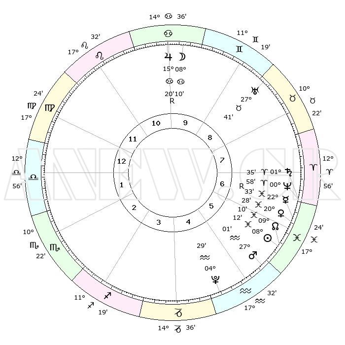 | | ΘΕΣΕΙΣ ΠΛΑΝΗΤΩΝ ΑΣΤΡΟΛΟΓΙΚΟΥ ΧΑΡΤΗ ΤΗΣ ΣΤΙΓΜΗΣ ΑΥΤΗΣ | | | | Πλανήτης | Ζώδιο | Μοίρες | Δεκαήμ. | Σε οίκο | Απόκλιση | | Ακμές των οίκων | | Ηλιος | Ιχθείς | 08°08' | Πρώτο | 6 | 08 S 31 | | 1ος | 23°17' | Παρθένος | | Σελήνη | Καρκίνος | 07°14' | Πρώτο | 10 | 27 N 53 | | 2ος | 19°22' | Ζυγός | | Ερμής | Ιχθείς | 22°33'R | Τρίτο | 6 | 00 S 18 | | 3ος | 19°31' | Σκορπιός | | Αφροδίτη | Ιχθείς | 20°23' | Τρίτο | 6 | 05 S 05 | | 4ος | 22°27' | Τοξότης | | Αρης | Υδροχόος | 26°58' | Τρίτο | 6 | 13 S 33 | | 5ος | 25°33' | Αιγόκερως | | Δίας | Καρκίνος | 15°20'R | Δεύτερο | 10 | 22 N 53 | | 6ος | 26°14' | Υδροχόος | | Κρόνος | Κριός | 01°34' | Πρώτο | 7 | 01 S 20 | | 7ος | 23°17' | Ιχθείς | | Ουρανός | Ταύρος | 27°41' | Τρίτο | 9 | 19 N 28 | | 8ος | 19°22' | Κριός | | Ποσειδώνας | Κριός | 00°58' | Πρώτο | 7 | 00 S 49 | | 9ος | 19°31' | Ταύρος | | Πλούτωνας | Υδροχόος | 04°28' | Πρώτο | 5 | 22 S 53 | | 10ος | 22°27' | Δίδυμοι | | Β. Δεσμός | Ιχθείς | 09°10' | Πρώτο | 6 | 08 S 08 | | 11ος | 25°33' | Καρκίνος | | Ωροσκόπος | Παρθένος | 23°17' | Τρίτο | | | 12ος | 26°14' | Λέων | | Μεσουράνημα | Δίδυμοι | 22°27' | Τρίτο | | | |