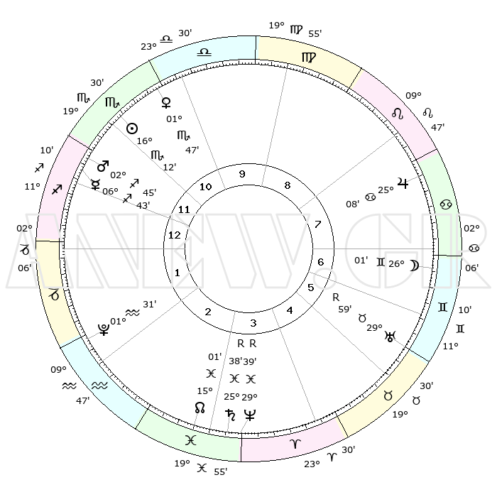 | | ΘΕΣΕΙΣ ΠΛΑΝΗΤΩΝ ΑΣΤΡΟΛΟΓΙΚΟΥ ΧΑΡΤΗ ΤΗΣ ΣΤΙΓΜΗΣ ΑΥΤΗΣ | | | | Πλανήτης | Ζώδιο | Μοίρες | Δεκαήμ. | Σε οίκο | Απόκλιση | | Ακμές των οίκων | | Ηλιος | Σκορπιός | 15°60' | Δεύτερο | 1 | 16 S 37 | | 1ος | 02°33' | Σκορπιός | | Σελήνη | Δίδυμοι | 23°03' | Τρίτο | 8 | 28 N 17 | | 2ος | 01°07' | Τοξότης | | Ερμής | Τοξότης | 06°41' | Πρώτο | 2 | 23 S 57 | | 3ος | 03°17' | Αιγόκερως | | Αφροδίτη | Σκορπιός | 01°32' | Πρώτο | 12 | 10 S 44 | | 4ος | 07°39' | Υδροχόος | | Αρης | Τοξότης | 02°37' | Πρώτο | 2 | 21 S 08 | | 5ος | 10°32' | Ιχθείς | | Δίας | Καρκίνος | 25°08' | Τρίτο | 9 | 21 N 12 | | 6ος | 08°58' | Κριός | | Κρόνος | Ιχθείς | 25°38'R | Τρίτο | 5 | 03 S 59 | | 7ος | 02°33' | Ταύρος | | Ουρανός | Ταύρος | 29°60'R | Τρίτο | 7 | 19 N 56 | | 8ος | 01°07' | Δίδυμοι | | Ποσειδώνας | Ιχθείς | 29°39'R | Τρίτο | 5 | 01 S 23 | | 9ος | 03°17' | Καρκίνος | | Πλούτωνας | Υδροχόος | 01°31' | Πρώτο | 3 | 23 S 30 | | 10ος | 07°39' | Λέων | | Β. Δεσμός | Ιχθείς | 15°01' | Δεύτερο | 5 | 05 S 54 | | 11ος | 10°32' | Παρθένος | | Ωροσκόπος | Σκορπιός | 02°33' | Πρώτο | | | 12ος | 08°58' | Ζυγός | | Μεσουράνημα | Λέων | 07°39' | Πρώτο | | | |
