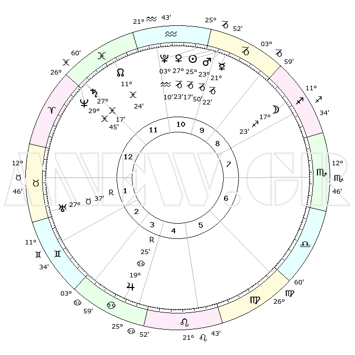 | | ΘΕΣΕΙΣ ΠΛΑΝΗΤΩΝ ΑΣΤΡΟΛΟΓΙΚΟΥ ΧΑΡΤΗ ΤΗΣ ΣΤΙΓΜΗΣ ΑΥΤΗΣ | | | | Πλανήτης | Ζώδιο | Μοίρες | Δεκαήμ. | Σε οίκο | Απόκλιση | | Ακμές των οίκων | | Ηλιος | Αιγόκερως | 25°13' | Τρίτο | 10 | 21 S 05 | | 1ος | 06°12' | Κριός | | Σελήνη | Τοξότης | 16°35' | Δεύτερο | 9 | 27 S 49 | | 2ος | 14°56' | Ταύρος | | Ερμής | Αιγόκερως | 21°15' | Τρίτο | 10 | 23 S 32 | | 3ος | 11°25' | Δίδυμοι | | Αφροδίτη | Αιγόκερως | 27°18' | Τρίτο | 11 | 21 S 40 | | 4ος | 03°29' | Καρκίνος | | Αρης | Αιγόκερως | 23°47' | Τρίτο | 10 | 22 S 18 | | 5ος | 26°05' | Καρκίνος | | Δίας | Καρκίνος | 19°26'R | Δεύτερο | 4 | 22 N 18 | | 6ος | 24°28' | Λέων | | Κρόνος | Ιχθείς | 27°16' | Τρίτο | 12 | 03 S 07 | | 7ος | 06°12' | Ζυγός | | Ουρανός | Ταύρος | 27°37'R | Τρίτο | 2 | 19 N 26 | | 8ος | 14°56' | Σκορπιός | | Ποσειδώνας | Ιχθείς | 29°45' | Τρίτο | 12 | 01 S 19 | | 9ος | 11°25' | Τοξότης | | Πλούτωνας | Υδροχόος | 03°10' | Πρώτο | 11 | 23 S 08 | | 10ος | 03°29' | Αιγόκερως | | Β. Δεσμός | Ιχθείς | 11°24' | Δεύτερο | 12 | 07 S 17 | | 11ος | 26°05' | Αιγόκερως | | Ωροσκόπος | Κριός | 06°12' | Πρώτο | | | 12ος | 24°28' | Υδροχόος | | Μεσουράνημα | Αιγόκερως | 03°29' | Πρώτο | | | |