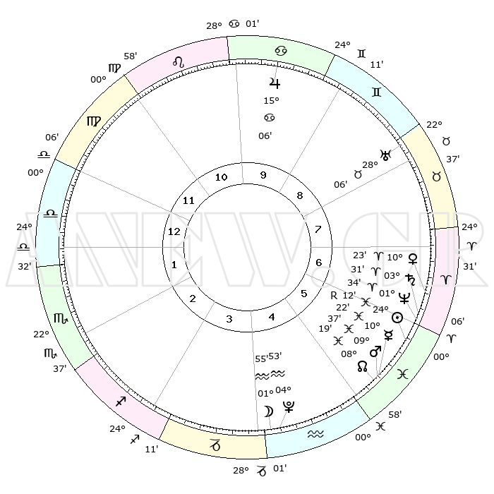 | | ΘΕΣΕΙΣ ΠΛΑΝΗΤΩΝ ΑΣΤΡΟΛΟΓΙΚΟΥ ΧΑΡΤΗ ΤΗΣ ΣΤΙΓΜΗΣ ΑΥΤΗΣ | | | | Πλανήτης | Ζώδιο | Μοίρες | Δεκαήμ. | Σε οίκο | Απόκλιση | | Ακμές των οίκων | | Ηλιος | Ιχθείς | 24°09' | Τρίτο | 6 | 02 S 19 | | 1ος | 09°27' | Ζυγός | | Σελήνη | Υδροχόος | 01°17' | Πρώτο | 4 | 23 S 01 | | 2ος | 06°40' | Σκορπιός | | Ερμής | Ιχθείς | 10°24'R | Δεύτερο | 5 | 05 S 22 | | 3ος | 07°28' | Τοξότης | | Αφροδίτη | Κριός | 10°19' | Δεύτερο | 7 | 03 N 07 | | 4ος | 10°38' | Αιγόκερως | | Αρης | Ιχθείς | 09°34' | Πρώτο | 5 | 08 S 59 | | 5ος | 13°34' | Υδροχόος | | Δίας | Καρκίνος | 15°06' | Δεύτερο | 10 | 22 N 56 | | 6ος | 13°36' | Ιχθείς | | Κρόνος | Κριός | 03°31' | Πρώτο | 6 | 00 S 33 | | 7ος | 09°27' | Κριός | | Ουρανός | Ταύρος | 28°06' | Τρίτο | 8 | 19 N 34 | | 8ος | 06°40' | Ταύρος | | Ποσειδώνας | Κριός | 01°33' | Πρώτο | 6 | 00 S 35 | | 9ος | 07°28' | Δίδυμοι | | Πλούτωνας | Υδροχόος | 04°53' | Πρώτο | 4 | 22 S 50 | | 10ος | 10°38' | Καρκίνος | | Β. Δεσμός | Ιχθείς | 08°19' | Πρώτο | 5 | 08 S 27 | | 11ος | 13°34' | Λέων | | Ωροσκόπος | Ζυγός | 09°27' | Πρώτο | | | 12ος | 13°36' | Παρθένος | | Μεσουράνημα | Καρκίνος | 10°38' | Δεύτερο | | | |