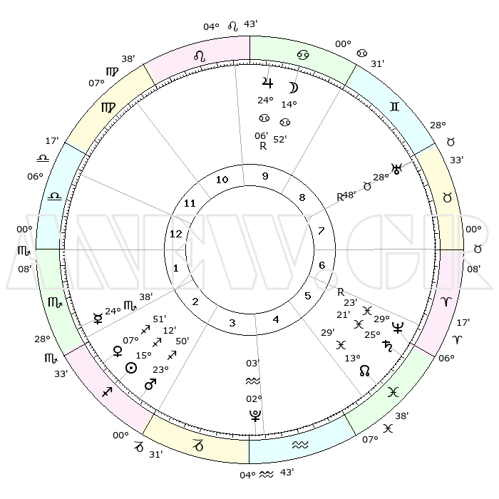 | | ΘΕΣΕΙΣ ΠΛΑΝΗΤΩΝ ΑΣΤΡΟΛΟΓΙΚΟΥ ΧΑΡΤΗ ΤΗΣ ΣΤΙΓΜΗΣ ΑΥΤΗΣ | | | | Πλανήτης | Ζώδιο | Μοίρες | Δεκαήμ. | Σε οίκο | Απόκλιση | | Ακμές των οίκων | | Ηλιος | Τοξότης | 15°09' | Δεύτερο | 2 | 22 S 36 | | 1ος | 16°32' | Ζυγός | | Σελήνη | Καρκίνος | 14°11' | Δεύτερο | 9 | 26 N 57 | | 2ος | 14°10' | Σκορπιός | | Ερμής | Σκορπιός | 24°35' | Τρίτο | 2 | 16 S 35 | | 3ος | 15°17' | Τοξότης | | Αφροδίτη | Τοξότης | 07°47' | Πρώτο | 2 | 21 S 08 | | 4ος | 18°43' | Αιγόκερως | | Αρης | Τοξότης | 23°47' | Τρίτο | 3 | 24 S 00 | | 5ος | 21°39' | Υδροχόος | | Δίας | Καρκίνος | 24°06'R | Τρίτο | 10 | 21 N 27 | | 6ος | 21°19' | Ιχθείς | | Κρόνος | Ιχθείς | 25°21' | Τρίτο | 6 | 04 S 00 | | 7ος | 16°32' | Κριός | | Ουρανός | Ταύρος | 28°48'R | Τρίτο | 8 | 19 N 41 | | 8ος | 14°10' | Ταύρος | | Ποσειδώνας | Ιχθείς | 29°23'R | Τρίτο | 6 | 01 S 29 | | 9ος | 15°17' | Δίδυμοι | | Πλούτωνας | Υδροχόος | 02°03' | Πρώτο | 4 | 23 S 22 | | 10ος | 18°43' | Καρκίνος | | Β. Δεσμός | Ιχθείς | 13°29' | Δεύτερο | 5 | 06 S 29 | | 11ος | 21°39' | Λέων | | Ωροσκόπος | Ζυγός | 16°32' | Δεύτερο | | | 12ος | 21°19' | Παρθένος | | Μεσουράνημα | Καρκίνος | 18°43' | Δεύτερο | | | |