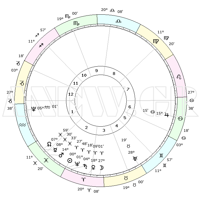 | | ΘΕΣΕΙΣ ΠΛΑΝΗΤΩΝ ΑΣΤΡΟΛΟΓΙΚΟΥ ΧΑΡΤΗ ΤΗΣ ΣΤΙΓΜΗΣ ΑΥΤΗΣ | | | | Πλανήτης | Ζώδιο | Μοίρες | Δεκαήμ. | Σε οίκο | Απόκλιση | | Ακμές των οίκων | | Ηλιος | Κριός | 00°23' | Πρώτο | 3 | 00 N 09 | | 1ος | 29°18' | Τοξότης | | Σελήνη | Κριός | 25°54' | Τρίτο | 4 | 13 N 35 | | 2ος | 06°17' | Υδροχόος | | Ερμής | Ιχθείς | 08°30' | Πρώτο | 2 | 07 S 30 | | 3ος | 16°14' | Ιχθείς | | Αφροδίτη | Κριός | 18°04' | Δεύτερο | 3 | 06 N 17 | | 4ος | 20°17' | Κριός | | Αρης | Ιχθείς | 14°30' | Δεύτερο | 2 | 07 S 06 | | 5ος | 16°42' | Ταύρος | | Δίας | Καρκίνος | 15°15' | Δεύτερο | 7 | 22 N 55 | | 6ος | 08°33' | Δίδυμοι | | Κρόνος | Κριός | 04°17' | Πρώτο | 3 | 00 S 15 | | 7ος | 29°18' | Δίδυμοι | | Ουρανός | Ταύρος | 28°19' | Τρίτο | 5 | 19 N 37 | | 8ος | 06°17' | Λέων | | Ποσειδώνας | Κριός | 01°48' | Πρώτο | 3 | 00 S 29 | | 9ος | 16°14' | Παρθένος | | Πλούτωνας | Υδροχόος | 05°01' | Πρώτο | 1 | 22 S 48 | | 10ος | 20°17' | Ζυγός | | Β. Δεσμός | Ιχθείς | 07°59' | Πρώτο | 2 | 08 S 34 | | 11ος | 16°42' | Σκορπιός | | Ωροσκόπος | Τοξότης | 29°18' | Τρίτο | | | 12ος | 08°33' | Τοξότης | | Μεσουράνημα | Ζυγός | 20°17' | Τρίτο | | | |