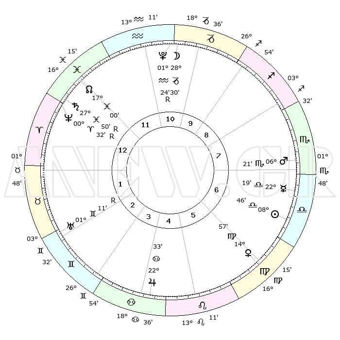 | ΘΕΣΕΙΣ ΠΛΑΝΗΤΩΝ ΑΣΤΡΟΛΟΓΙΚΟΥ ΧΑΡΤΗ ΤΗΣ ΣΤΙΓΜΗΣ ΑΥΤΗΣ | | Πλανήτης | Ζώδιο | Μοίρες | Δεκαήμ. | Σε οίκο | Απόκλιση | | Ακμές των οίκων | Ηλιος | Ζυγός | 08°42' | Πρώτο | 7 | 03 S 27 | | 1ος | 13°30' | Ιχθείς | Σελήνη | Αιγόκερως | 27°26' | Τρίτο | 11 | 24 S 40 | | 2ος | 27°13' | Κριός | Ερμής | Ζυγός | 22°11' | Τρίτο | 7 | 08 S 48 | | 3ος | 27°23' | Ταύρος | Αφροδίτη | Παρθένος | 14°51' | Δεύτερο | 7 | 07 N 10 | | 4ος | 20°38' | Δίδυμοι | Αρης | Σκορπιός | 06°18' | Πρώτο | 8 | 13 S 42 | | 5ος | 12°25' | Καρκίνος | Δίας | Καρκίνος | 22°33' | Τρίτο | 5 | 21 N 34 | | 6ος | 07°31' | Λέων | Κρόνος | Ιχθείς | 27°50'R | Τρίτο | 1 | 03 S 10 | | 7ος | 13°30' | Παρθένος | Ουρανός | Δίδυμοι | 01°12'R | Πρώτο | 3 | 20 N 11 | | 8ος | 27°13' | Ζυγός | Ποσειδώνας | Κριός | 00°32'R | Πρώτο | 1 | 01 S 03 | | 9ος | 27°23' | Σκορπιός | Πλούτωνας | Υδροχόος | 01°24'R | Πρώτο | 11 | 23 S 32 | | 10ος | 20°38' | Τοξότης | Β. Δεσμός | Ιχθείς | 17°00' | Δεύτερο | 1 | 05 S 08 | | 11ος | 12°25' | Αιγόκερως | Ωροσκόπος | Ιχθείς | 13°30' | Δεύτερο | | | 12ος | 07°31' | Υδροχόος | Μεσουράνημα | Τοξότης | 20°38' | Τρίτο | | | |