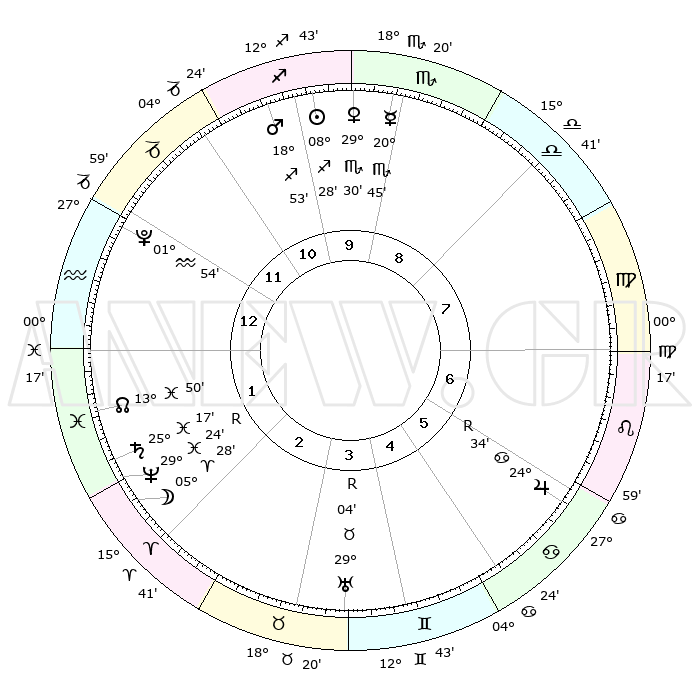 | | ΘΕΣΕΙΣ ΠΛΑΝΗΤΩΝ ΑΣΤΡΟΛΟΓΙΚΟΥ ΧΑΡΤΗ ΤΗΣ ΣΤΙΓΜΗΣ ΑΥΤΗΣ | | | | Πλανήτης | Ζώδιο | Μοίρες | Δεκαήμ. | Σε οίκο | Απόκλιση | | Ακμές των οίκων | | Ηλιος | Τοξότης | 08°26' | Πρώτο | 10 | 21 S 42 | | 1ος | 08°07' | Υδροχόος | | Σελήνη | Κριός | 04°51' | Πρώτο | 2 | 03 N 33 | | 2ος | 23°18' | Ιχθείς | | Ερμής | Σκορπιός | 20°45' | Τρίτο | 9 | 15 S 27 | | 3ος | 00°21' | Ταύρος | | Αφροδίτη | Σκορπιός | 29°27' | Τρίτο | 10 | 19 S 19 | | 4ος | 27°30' | Ταύρος | | Αρης | Τοξότης | 18°51' | Δεύτερο | 10 | 23 S 37 | | 5ος | 19°45' | Δίδυμοι | | Δίας | Καρκίνος | 24°34'R | Τρίτο | 6 | 21 N 21 | | 6ος | 11°33' | Καρκίνος | | Κρόνος | Ιχθείς | 25°17' | Τρίτο | 2 | 04 S 03 | | 7ος | 08°07' | Λέων | | Ουρανός | Ταύρος | 29°04'R | Τρίτο | 4 | 19 N 45 | | 8ος | 23°18' | Παρθένος | | Ποσειδώνας | Ιχθείς | 29°24'R | Τρίτο | 2 | 01 S 29 | | 9ος | 00°21' | Σκορπιός | | Πλούτωνας | Υδροχόος | 01°54' | Πρώτο | 12 | 23 S 24 | | 10ος | 27°30' | Σκορπιός | | Β. Δεσμός | Ιχθείς | 13°51' | Δεύτερο | 1 | 06 S 21 | | 11ος | 19°45' | Τοξότης | | Ωροσκόπος | Υδροχόος | 08°07' | Πρώτο | | | 12ος | 11°33' | Αιγόκερως | | Μεσουράνημα | Σκορπιός | 27°30' | Τρίτο | | | |