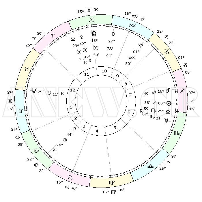 | | ΘΕΣΕΙΣ ΠΛΑΝΗΤΩΝ ΑΣΤΡΟΛΟΓΙΚΟΥ ΧΑΡΤΗ ΤΗΣ ΣΤΙΓΜΗΣ ΑΥΤΗΣ | | | | Πλανήτης | Ζώδιο | Μοίρες | Δεκαήμ. | Σε οίκο | Απόκλιση | | Ακμές των οίκων | | Ηλιος | Τοξότης | 05°36' | Πρώτο | 7 | 21 S 14 | | 1ος | 25°51' | Ταύρος | | Σελήνη | Υδροχόος | 27°22' | Τρίτο | 10 | 13 S 46 | | 2ος | 21°32' | Δίδυμοι | | Ερμής | Σκορπιός | 21°08'R | Τρίτο | 6 | 15 S 46 | | 3ος | 13°07' | Καρκίνος | | Αφροδίτη | Σκορπιός | 25°57' | Τρίτο | 7 | 18 S 26 | | 4ος | 05°36' | Λέων | | Αρης | Τοξότης | 16°48' | Δεύτερο | 7 | 23 S 25 | | 5ος | 03°22' | Παρθένος | | Δίας | Καρκίνος | 24°44'R | Τρίτο | 3 | 21 N 19 | | 6ος | 11°08' | Ζυγός | | Κρόνος | Ιχθείς | 25°17'R | Τρίτο | 11 | 04 S 04 | | 7ος | 25°51' | Σκορπιός | | Ουρανός | Ταύρος | 29°11'R | Τρίτο | 1 | 19 N 46 | | 8ος | 21°32' | Τοξότης | | Ποσειδώνας | Ιχθείς | 29°25'R | Τρίτο | 11 | 01 S 28 | | 9ος | 13°07' | Αιγόκερως | | Πλούτωνας | Υδροχόος | 01°50' | Πρώτο | 9 | 23 S 25 | | 10ος | 05°36' | Υδροχόος | | Β. Δεσμός | Ιχθείς | 13°59' | Δεύτερο | 11 | 06 S 18 | | 11ος | 03°22' | Ιχθείς | | Ωροσκόπος | Ταύρος | 25°51' | Τρίτο | | | 12ος | 11°08' | Κριός | | Μεσουράνημα | Υδροχόος | 05°36' | Πρώτο | | | |