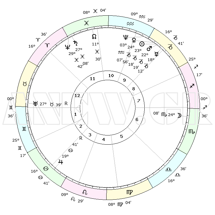 | | ΘΕΣΕΙΣ ΠΛΑΝΗΤΩΝ ΑΣΤΡΟΛΟΓΙΚΟΥ ΧΑΡΤΗ ΤΗΣ ΣΤΙΓΜΗΣ ΑΥΤΗΣ | | | | Πλανήτης | Ζώδιο | Μοίρες | Δεκαήμ. | Σε οίκο | Απόκλιση | | Ακμές των οίκων | | Ηλιος | Αιγόκερως | 23°13' | Τρίτο | 10 | 21 S 26 | | 1ος | 19°55' | Κριός | | Σελήνη | Σκορπιός | 23°10' | Τρίτο | 7 | 23 S 18 | | 2ος | 24°57' | Ταύρος | | Ερμής | Αιγόκερως | 18°04' | Δεύτερο | 10 | 23 S 53 | | 3ος | 19°37' | Δίδυμοι | | Αφροδίτη | Αιγόκερως | 24°49' | Τρίτο | 10 | 22 S 04 | | 4ος | 11°21' | Καρκίνος | | Αρης | Αιγόκερως | 22°15' | Τρίτο | 10 | 22 S 33 | | 5ος | 04°52' | Λέων | | Δίας | Καρκίνος | 19°42'R | Δεύτερο | 4 | 22 N 15 | | 6ος | 05°39' | Παρθένος | | Κρόνος | Ιχθείς | 27°07' | Τρίτο | 12 | 03 S 11 | | 7ος | 19°55' | Ζυγός | | Ουρανός | Ταύρος | 27°40'R | Τρίτο | 2 | 19 N 27 | | 8ος | 24°57' | Σκορπιός | | Ποσειδώνας | Ιχθείς | 29°42' | Τρίτο | 12 | 01 S 20 | | 9ος | 19°37' | Τοξότης | | Πλούτωνας | Υδροχόος | 03°06' | Πρώτο | 10 | 23 S 08 | | 10ος | 11°21' | Αιγόκερως | | Β. Δεσμός | Ιχθείς | 11°31' | Δεύτερο | 12 | 07 S 15 | | 11ος | 04°52' | Υδροχόος | | Ωροσκόπος | Κριός | 19°55' | Δεύτερο | | | 12ος | 05°39' | Ιχθείς | | Μεσουράνημα | Αιγόκερως | 11°21' | Δεύτερο | | | |