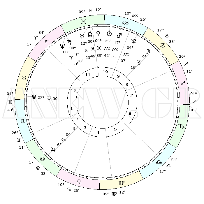 | | ΘΕΣΕΙΣ ΠΛΑΝΗΤΩΝ ΑΣΤΡΟΛΟΓΙΚΟΥ ΧΑΡΤΗ ΤΗΣ ΣΤΙΓΜΗΣ ΑΥΤΗΣ | | | | Πλανήτης | Ζώδιο | Μοίρες | Δεκαήμ. | Σε οίκο | Απόκλιση | | Ακμές των οίκων | | Ηλιος | Υδροχόος | 25°38' | Τρίτο | 11 | 12 S 58 | | 1ος | 29°50' | Κριός | | Σελήνη | Αιγόκερως | 18°27' | Δεύτερο | 10 | 26 S 12 | | 2ος | 02°06' | Δίδυμοι | | Ερμής | Ιχθείς | 12°17' | Δεύτερο | 11 | 07 S 02 | | 3ος | 25°41' | Δίδυμοι | | Αφροδίτη | Ιχθείς | 04°54' | Πρώτο | 11 | 11 S 04 | | 4ος | 17°22' | Καρκίνος | | Αρης | Υδροχόος | 17°12' | Δεύτερο | 11 | 16 S 42 | | 5ος | 11°45' | Λέων | | Δίας | Καρκίνος | 16°05'R | Δεύτερο | 3 | 22 N 47 | | 6ος | 14°26' | Παρθένος | | Κρόνος | Κριός | 00°09' | Πρώτο | 12 | 01 S 55 | | 7ος | 29°50' | Ζυγός | | Ουρανός | Ταύρος | 27°30' | Τρίτο | 1 | 19 N 25 | | 8ος | 02°06' | Τοξότης | | Ποσειδώνας | Κριός | 00°33' | Πρώτο | 12 | 00 S 59 | | 9ος | 25°41' | Τοξότης | | Πλούτωνας | Υδροχόος | 04°07' | Πρώτο | 10 | 22 S 57 | | 10ος | 17°22' | Αιγόκερως | | Β. Δεσμός | Ιχθείς | 09°49' | Πρώτο | 11 | 07 S 53 | | 11ος | 11°45' | Υδροχόος | | Ωροσκόπος | Κριός | 29°50' | Τρίτο | | | 12ος | 14°26' | Ιχθείς | | Μεσουράνημα | Αιγόκερως | 17°22' | Δεύτερο | | | |