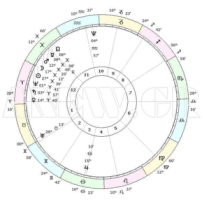 | | ΘΕΣΕΙΣ ΠΛΑΝΗΤΩΝ ΑΣΤΡΟΛΟΓΙΚΟΥ ΧΑΡΤΗ ΤΗΣ ΣΤΙΓΜΗΣ ΑΥΤΗΣ | | | | Πλανήτης | Ζώδιο | Μοίρες | Δεκαήμ. | Σε οίκο | Απόκλιση | | Ακμές των οίκων | | Ηλιος | Ιχθείς | 27°35' | Τρίτο | 1 | 00 S 58 | | 1ος | 18°56' | Ιχθείς | | Σελήνη | Ιχθείς | 16°16' | Δεύτερο | 12 | 04 S 48 | | 2ος | 01°40' | Ταύρος | | Ερμής | Ιχθείς | 08°51'R | Πρώτο | 12 | 06 S 44 | | 3ος | 00°52' | Δίδυμοι | | Αφροδίτη | Κριός | 14°35' | Δεύτερο | 1 | 04 N 52 | | 4ος | 23°46' | Δίδυμοι | | Αρης | Ιχθείς | 12°17' | Δεύτερο | 12 | 07 S 57 | | 5ος | 15°40' | Καρκίνος | | Δίας | Καρκίνος | 15°10' | Δεύτερο | 4 | 22 N 56 | | 6ος | 11°29' | Λέων | | Κρόνος | Κριός | 03°56' | Πρώτο | 1 | 00 S 23 | | 7ος | 18°56' | Παρθένος | | Ουρανός | Ταύρος | 28°13' | Τρίτο | 2 | 19 N 35 | | 8ος | 01°40' | Σκορπιός | | Ποσειδώνας | Κριός | 01°41' | Πρώτο | 1 | 00 S 32 | | 9ος | 00°52' | Τοξότης | | Πλούτωνας | Υδροχόος | 04°57' | Πρώτο | 11 | 22 S 49 | | 10ος | 23°46' | Τοξότης | | Β. Δεσμός | Ιχθείς | 08°08' | Πρώτο | 12 | 08 S 31 | | 11ος | 15°40' | Αιγόκερως | | Ωροσκόπος | Ιχθείς | 18°56' | Δεύτερο | | | 12ος | 11°29' | Υδροχόος | | Μεσουράνημα | Τοξότης | 23°46' | Τρίτο | | | |