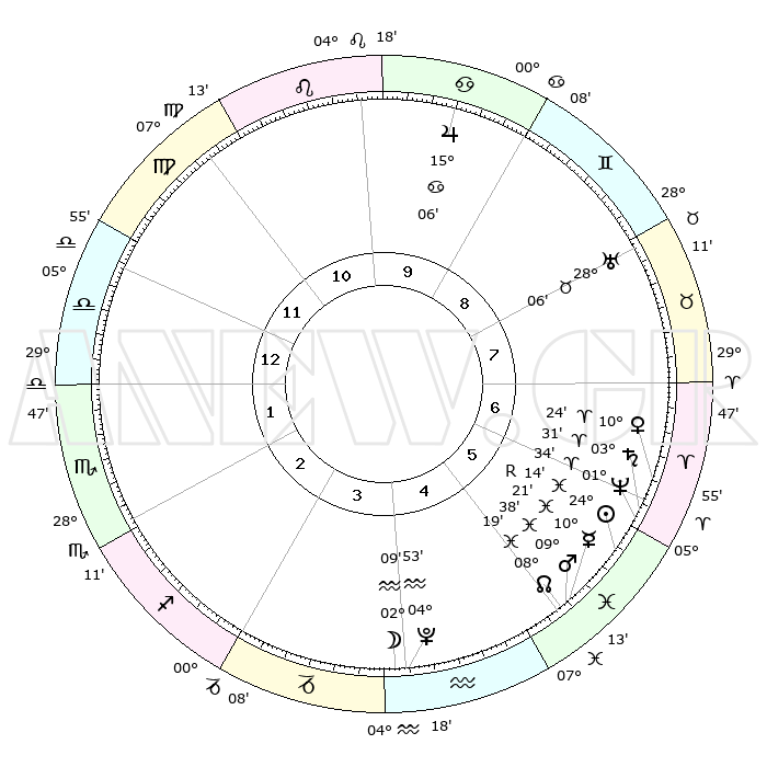 | | ΘΕΣΕΙΣ ΠΛΑΝΗΤΩΝ ΑΣΤΡΟΛΟΓΙΚΟΥ ΧΑΡΤΗ ΤΗΣ ΣΤΙΓΜΗΣ ΑΥΤΗΣ | | | | Πλανήτης | Ζώδιο | Μοίρες | Δεκαήμ. | Σε οίκο | Απόκλιση | | Ακμές των οίκων | | Ηλιος | Ιχθείς | 24°10' | Τρίτο | 6 | 02 S 19 | | 1ος | 11°29' | Ζυγός | | Σελήνη | Υδροχόος | 01°22' | Πρώτο | 4 | 22 S 59 | | 2ος | 08°50' | Σκορπιός | | Ερμής | Ιχθείς | 10°24'R | Δεύτερο | 5 | 05 S 23 | | 3ος | 09°43' | Τοξότης | | Αφροδίτη | Κριός | 10°19' | Δεύτερο | 6 | 03 N 07 | | 4ος | 12°57' | Αιγόκερως | | Αρης | Ιχθείς | 09°35' | Πρώτο | 5 | 08 S 59 | | 5ος | 15°53' | Υδροχόος | | Δίας | Καρκίνος | 15°06' | Δεύτερο | 10 | 22 N 56 | | 6ος | 15°49' | Ιχθείς | | Κρόνος | Κριός | 03°31' | Πρώτο | 6 | 00 S 33 | | 7ος | 11°29' | Κριός | | Ουρανός | Ταύρος | 28°06' | Τρίτο | 8 | 19 N 34 | | 8ος | 08°50' | Ταύρος | | Ποσειδώνας | Κριός | 01°33' | Πρώτο | 6 | 00 S 35 | | 9ος | 09°43' | Δίδυμοι | | Πλούτωνας | Υδροχόος | 04°53' | Πρώτο | 4 | 22 S 50 | | 10ος | 12°57' | Καρκίνος | | Β. Δεσμός | Ιχθείς | 08°19' | Πρώτο | 5 | 08 S 27 | | 11ος | 15°53' | Λέων | | Ωροσκόπος | Ζυγός | 11°29' | Δεύτερο | | | 12ος | 15°49' | Παρθένος | | Μεσουράνημα | Καρκίνος | 12°57' | Δεύτερο | | | |