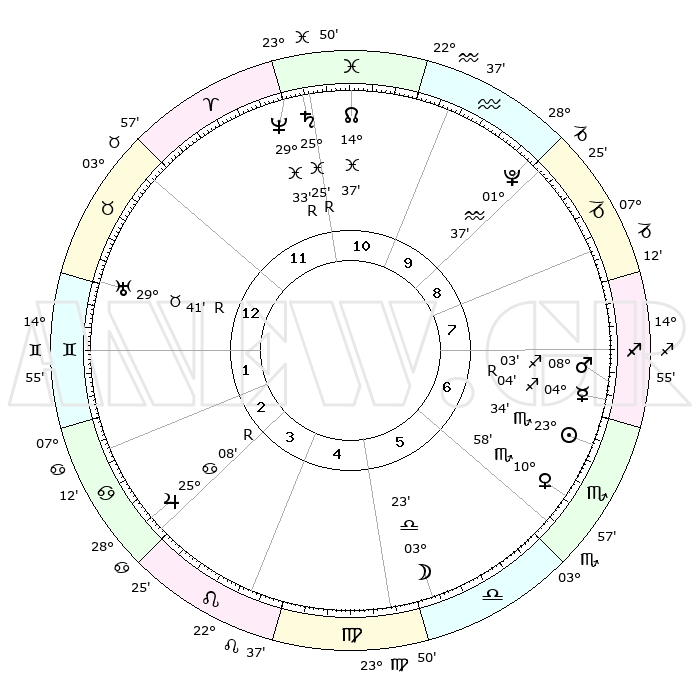 | | ΘΕΣΕΙΣ ΠΛΑΝΗΤΩΝ ΑΣΤΡΟΛΟΓΙΚΟΥ ΧΑΡΤΗ ΤΗΣ ΣΤΙΓΜΗΣ ΑΥΤΗΣ | | | | Πλανήτης | Ζώδιο | Μοίρες | Δεκαήμ. | Σε οίκο | Απόκλιση | | Ακμές των οίκων | | Ηλιος | Σκορπιός | 23°29' | Τρίτο | 7 | 18 S 38 | | 1ος | 10°45' | Ταύρος | | Σελήνη | Ζυγός | 02°25' | Πρώτο | 6 | 02 S 16 | | 2ος | 10°05' | Δίδυμοι | | Ερμής | Τοξότης | 04°08'R | Πρώτο | 7 | 22 S 00 | | 3ος | 02°39' | Καρκίνος | | Αφροδίτη | Σκορπιός | 10°52' | Δεύτερο | 7 | 13 S 57 | | 4ος | 24°29' | Καρκίνος | | Αρης | Τοξότης | 07°60' | Πρώτο | 7 | 22 S 09 | | 5ος | 20°05' | Λέων | | Δίας | Καρκίνος | 25°08'R | Τρίτο | 4 | 21 N 13 | | 6ος | 24°57' | Παρθένος | | Κρόνος | Ιχθείς | 25°25'R | Τρίτο | 12 | 04 S 03 | | 7ος | 10°45' | Σκορπιός | | Ουρανός | Ταύρος | 29°41'R | Τρίτο | 1 | 19 N 53 | | 8ος | 10°04' | Τοξότης | | Ποσειδώνας | Ιχθείς | 29°33'R | Τρίτο | 12 | 01 S 26 | | 9ος | 02°39' | Αιγόκερως | | Πλούτωνας | Υδροχόος | 01°37' | Πρώτο | 10 | 23 S 28 | | 10ος | 24°29' | Αιγόκερως | | Β. Δεσμός | Ιχθείς | 14°38' | Δεύτερο | 11 | 06 S 03 | | 11ος | 20°05' | Υδροχόος | | Ωροσκόπος | Ταύρος | 10°45' | Δεύτερο | | | 12ος | 24°57' | Ιχθείς | | Μεσουράνημα | Αιγόκερως | 24°29' | Τρίτο | | | |
