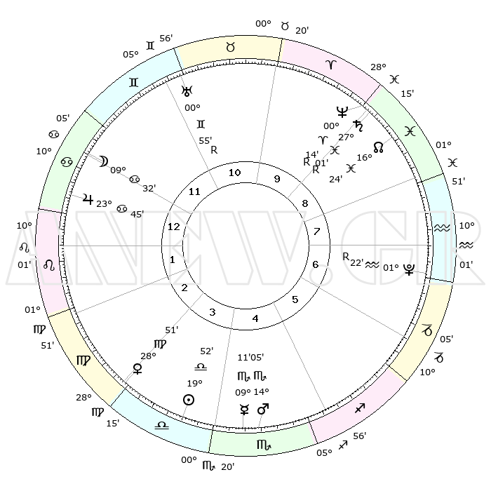 | ΘΕΣΕΙΣ ΠΛΑΝΗΤΩΝ ΑΣΤΡΟΛΟΓΙΚΟΥ ΧΑΡΤΗ ΤΗΣ ΣΤΙΓΜΗΣ ΑΥΤΗΣ | | Πλανήτης | Ζώδιο | Μοίρες | Δεκαήμ. | Σε οίκο | Απόκλιση | | Ακμές των οίκων | Ηλιος | Ζυγός | 19°46' | Δεύτερο | 4 | 07 S 44 | | 1ος | 09°14' | Καρκίνος | Σελήνη | Καρκίνος | 08°05' | Πρώτο | 12 | 28 N 04 | | 2ος | 29°41' | Καρκίνος | Ερμής | Σκορπιός | 09°02' | Πρώτο | 5 | 15 S 55 | | 3ος | 22°14' | Λέων | Αφροδίτη | Παρθένος | 28°43' | Τρίτο | 4 | 01 N 53 | | 4ος | 20°04' | Παρθένος | Αρης | Σκορπιός | 14°01' | Δεύτερο | 5 | 16 S 14 | | 5ος | 25°16' | Ζυγός | Δίας | Καρκίνος | 23°44' | Τρίτο | 1 | 21 N 23 | | 6ος | 04°18' | Τοξότης | Κρόνος | Ιχθείς | 27°02'R | Τρίτο | 10 | 03 S 29 | | 7ος | 09°14' | Αιγόκερως | Ουρανός | Δίδυμοι | 00°55'R | Πρώτο | 11 | 20 N 08 | | 8ος | 29°41' | Αιγόκερως | Ποσειδώνας | Κριός | 00°14'R | Πρώτο | 10 | 01 S 10 | | 9ος | 22°14' | Υδροχόος | Πλούτωνας | Υδροχόος | 01°22'R | Πρώτο | 8 | 23 S 32 | | 10ος | 20°04' | Ιχθείς | Β. Δεσμός | Ιχθείς | 16°25' | Δεύτερο | 9 | 05 S 22 | | 11ος | 25°16' | Κριός | Ωροσκόπος | Καρκίνος | 09°14' | Πρώτο | | | 12ος | 04°18' | Δίδυμοι | Μεσουράνημα | Ιχθείς | 20°04' | Τρίτο | | | |