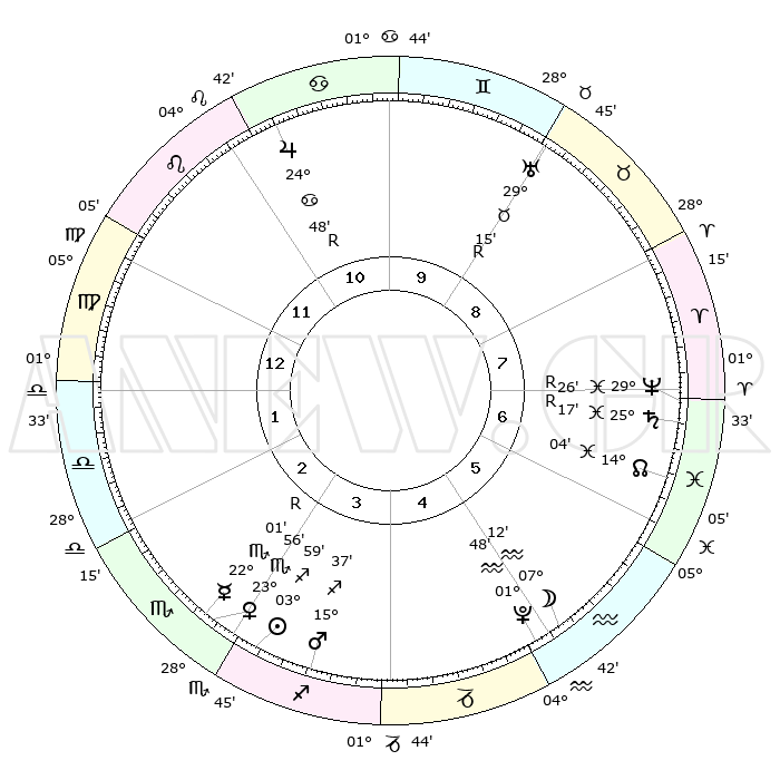 | | ΘΕΣΕΙΣ ΠΛΑΝΗΤΩΝ ΑΣΤΡΟΛΟΓΙΚΟΥ ΧΑΡΤΗ ΤΗΣ ΣΤΙΓΜΗΣ ΑΥΤΗΣ | | | | Πλανήτης | Ζώδιο | Μοίρες | Δεκαήμ. | Σε οίκο | Απόκλιση | | Ακμές των οίκων | | Ηλιος | Τοξότης | 03°54' | Πρώτο | 3 | 20 S 56 | | 1ος | 09°04' | Παρθένος | | Σελήνη | Υδροχόος | 06°15' | Πρώτο | 5 | 21 S 43 | | 2ος | 03°51' | Ζυγός | | Ερμής | Σκορπιός | 22°04'R | Τρίτο | 3 | 16 S 16 | | 3ος | 03°15' | Σκορπιός | | Αφροδίτη | Σκορπιός | 23°50' | Τρίτο | 3 | 17 S 52 | | 4ος | 06°12' | Τοξότης | | Αρης | Τοξότης | 15°33' | Δεύτερο | 4 | 23 S 16 | | 5ος | 09°50' | Αιγόκερως | | Δίας | Καρκίνος | 24°49'R | Τρίτο | 11 | 21 N 18 | | 6ος | 11°11' | Υδροχόος | | Κρόνος | Ιχθείς | 25°17'R | Τρίτο | 7 | 04 S 04 | | 7ος | 09°04' | Ιχθείς | | Ουρανός | Ταύρος | 29°15'R | Τρίτο | 9 | 19 N 47 | | 8ος | 03°51' | Κριός | | Ποσειδώνας | Ιχθείς | 29°26'R | Τρίτο | 7 | 01 S 28 | | 9ος | 03°15' | Ταύρος | | Πλούτωνας | Υδροχόος | 01°48' | Πρώτο | 5 | 23 S 25 | | 10ος | 06°12' | Δίδυμοι | | Β. Δεσμός | Ιχθείς | 14°05' | Δεύτερο | 7 | 06 S 16 | | 11ος | 09°50' | Καρκίνος | | Ωροσκόπος | Παρθένος | 09°04' | Πρώτο | | | 12ος | 11°11' | Λέων | | Μεσουράνημα | Δίδυμοι | 06°12' | Πρώτο | | | |