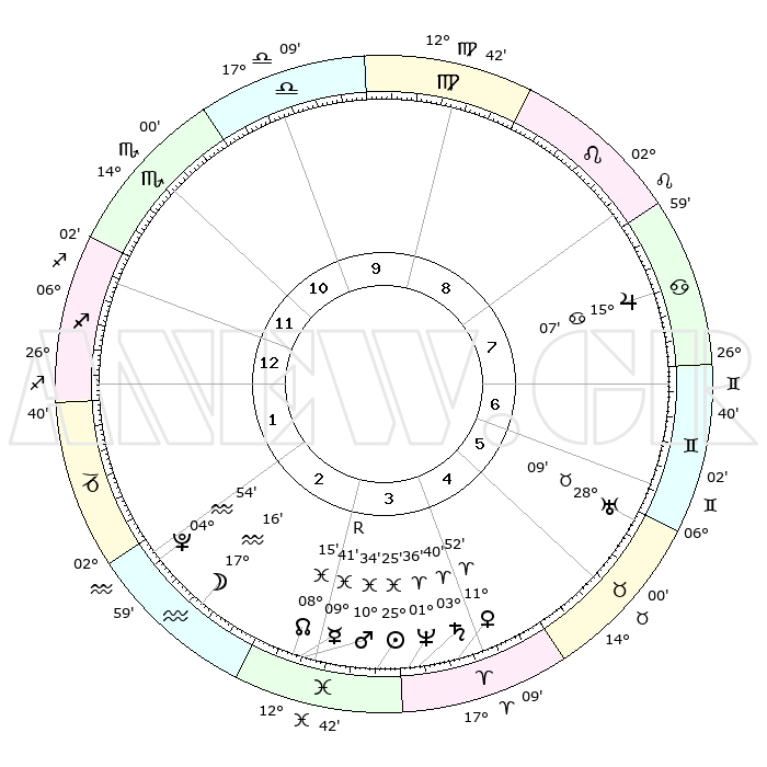 | | ΘΕΣΕΙΣ ΠΛΑΝΗΤΩΝ ΑΣΤΡΟΛΟΓΙΚΟΥ ΧΑΡΤΗ ΤΗΣ ΣΤΙΓΜΗΣ ΑΥΤΗΣ | | | | Πλανήτης | Ζώδιο | Μοίρες | Δεκαήμ. | Σε οίκο | Απόκλιση | | Ακμές των οίκων | | Ηλιος | Ιχθείς | 25°21' | Τρίτο | 4 | 01 S 51 | | 1ος | 06°57' | Τοξότης | | Σελήνη | Υδροχόος | 16°26' | Δεύτερο | 3 | 17 S 50 | | 2ος | 09°09' | Αιγόκερως | | Ερμής | Ιχθείς | 09°43'R | Πρώτο | 3 | 05 S 53 | | 3ος | 16°02' | Υδροχόος | | Αφροδίτη | Κριός | 11°48' | Δεύτερο | 4 | 03 N 43 | | 4ος | 22°06' | Ιχθείς | | Αρης | Ιχθείς | 10°31' | Δεύτερο | 3 | 08 S 38 | | 5ος | 22°11' | Κριός | | Δίας | Καρκίνος | 15°07' | Δεύτερο | 8 | 22 N 56 | | 6ος | 16°18' | Ταύρος | | Κρόνος | Κριός | 03°40' | Πρώτο | 4 | 00 S 30 | | 7ος | 06°57' | Δίδυμοι | | Ουρανός | Ταύρος | 28°09' | Τρίτο | 6 | 19 N 34 | | 8ος | 09°09' | Καρκίνος | | Ποσειδώνας | Κριός | 01°36' | Πρώτο | 4 | 00 S 34 | | 9ος | 16°02' | Λέων | | Πλούτωνας | Υδροχόος | 04°54' | Πρώτο | 2 | 22 S 49 | | 10ος | 22°06' | Παρθένος | | Β. Δεσμός | Ιχθείς | 08°15' | Πρώτο | 3 | 08 S 28 | | 11ος | 22°11' | Ζυγός | | Ωροσκόπος | Τοξότης | 06°57' | Πρώτο | | | 12ος | 16°18' | Σκορπιός | | Μεσουράνημα | Παρθένος | 22°06' | Τρίτο | | | |