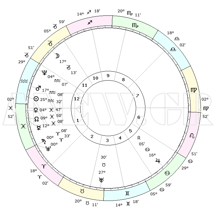 | | ΘΕΣΕΙΣ ΠΛΑΝΗΤΩΝ ΑΣΤΡΟΛΟΓΙΚΟΥ ΧΑΡΤΗ ΤΗΣ ΣΤΙΓΜΗΣ ΑΥΤΗΣ | | | | Πλανήτης | Ζώδιο | Μοίρες | Δεκαήμ. | Σε οίκο | Απόκλιση | | Ακμές των οίκων | | Ηλιος | Υδροχόος | 25°27' | Τρίτο | 1 | 13 S 02 | | 1ος | 24°37' | Αιγόκερως | | Σελήνη | Αιγόκερως | 16°14' | Δεύτερο | 12 | 26 S 37 | | 2ος | 07°43' | Ιχθείς | | Ερμής | Ιχθείς | 12°01' | Δεύτερο | 2 | 07 S 10 | | 3ος | 16°56' | Κριός | | Αφροδίτη | Ιχθείς | 04°41' | Πρώτο | 1 | 11 S 09 | | 4ος | 16°22' | Ταύρος | | Αρης | Υδροχόος | 17°04' | Δεύτερο | 1 | 16 S 45 | | 5ος | 09°34' | Δίδυμοι | | Δίας | Καρκίνος | 16°05'R | Δεύτερο | 6 | 22 N 47 | | 6ος | 00°50' | Καρκίνος | | Κρόνος | Κριός | 00°08' | Πρώτο | 2 | 01 S 55 | | 7ος | 24°37' | Καρκίνος | | Ουρανός | Ταύρος | 27°30' | Τρίτο | 4 | 19 N 25 | | 8ος | 07°43' | Παρθένος | | Ποσειδώνας | Κριός | 00°32' | Πρώτο | 2 | 00 S 59 | | 9ος | 16°56' | Ζυγός | | Πλούτωνας | Υδροχόος | 04°07' | Πρώτο | 1 | 22 S 57 | | 10ος | 16°22' | Σκορπιός | | Β. Δεσμός | Ιχθείς | 09°50' | Πρώτο | 2 | 07 S 53 | | 11ος | 09°34' | Τοξότης | | Ωροσκόπος | Αιγόκερως | 24°37' | Τρίτο | | | 12ος | 00°50' | Αιγόκερως | | Μεσουράνημα | Σκορπιός | 16°22' | Δεύτερο | | | |