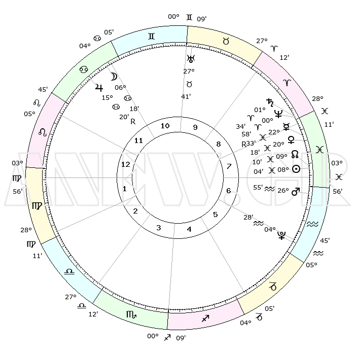 | | ΘΕΣΕΙΣ ΠΛΑΝΗΤΩΝ ΑΣΤΡΟΛΟΓΙΚΟΥ ΧΑΡΤΗ ΤΗΣ ΣΤΙΓΜΗΣ ΑΥΤΗΣ | | | | Πλανήτης | Ζώδιο | Μοίρες | Δεκαήμ. | Σε οίκο | Απόκλιση | | Ακμές των οίκων | | Ηλιος | Ιχθείς | 08°00' | Πρώτο | 7 | 08 S 34 | | 1ος | 16°23' | Λέων | | Σελήνη | Καρκίνος | 05°26' | Πρώτο | 11 | 28 N 03 | | 2ος | 08°50' | Παρθένος | | Ερμής | Ιχθείς | 22°33'R | Τρίτο | 8 | 00 S 20 | | 3ος | 06°02' | Ζυγός | | Αφροδίτη | Ιχθείς | 20°14' | Τρίτο | 8 | 05 S 09 | | 4ος | 08°32' | Σκορπιός | | Αρης | Υδροχόος | 26°52' | Τρίτο | 7 | 13 S 35 | | 5ος | 13°43' | Τοξότης | | Δίας | Καρκίνος | 15°20'R | Δεύτερο | 11 | 22 N 53 | | 6ος | 17°02' | Αιγόκερως | | Κρόνος | Κριός | 01°33' | Πρώτο | 8 | 01 S 20 | | 7ος | 16°23' | Υδροχόος | | Ουρανός | Ταύρος | 27°41' | Τρίτο | 10 | 19 N 28 | | 8ος | 08°50' | Ιχθείς | | Ποσειδώνας | Κριός | 00°58' | Πρώτο | 8 | 00 S 49 | | 9ος | 06°02' | Κριός | | Πλούτωνας | Υδροχόος | 04°28' | Πρώτο | 6 | 22 S 53 | | 10ος | 08°32' | Ταύρος | | Β. Δεσμός | Ιχθείς | 09°10' | Πρώτο | 8 | 08 S 08 | | 11ος | 13°43' | Δίδυμοι | | Ωροσκόπος | Λέων | 16°23' | Δεύτερο | | | 12ος | 17°02' | Καρκίνος | | Μεσουράνημα | Ταύρος | 08°32' | Πρώτο | | | |