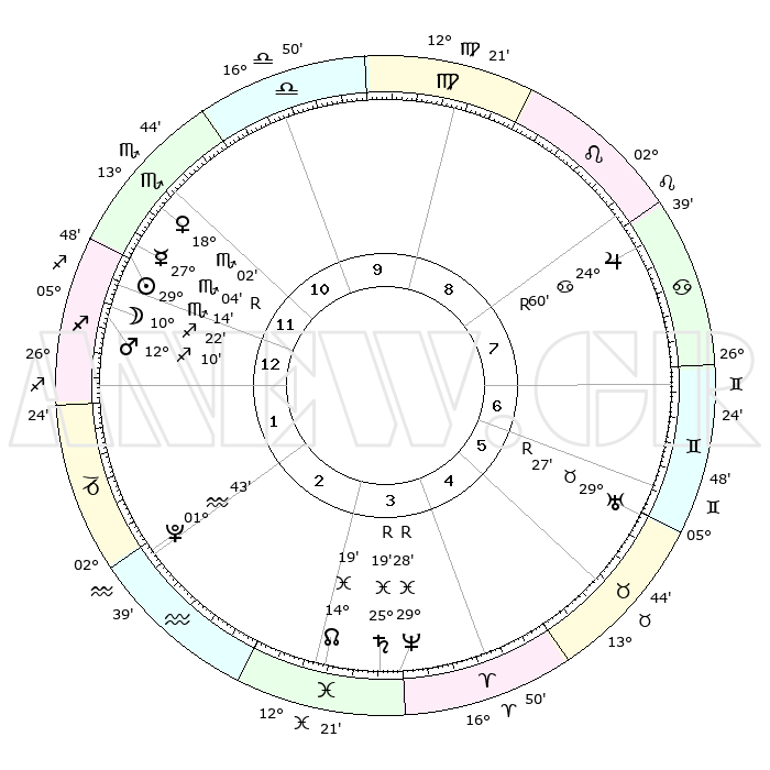 | | ΘΕΣΕΙΣ ΠΛΑΝΗΤΩΝ ΑΣΤΡΟΛΟΓΙΚΟΥ ΧΑΡΤΗ ΤΗΣ ΣΤΙΓΜΗΣ ΑΥΤΗΣ | | | | Πλανήτης | Ζώδιο | Μοίρες | Δεκαήμ. | Σε οίκο | Απόκλιση | | Ακμές των οίκων | | Ηλιος | Σκορπιός | 29°12' | Τρίτο | 12 | 19 S 58 | | 1ος | 12°58' | Τοξότης | | Σελήνη | Τοξότης | 09°52' | Πρώτο | 12 | 26 S 51 | | 2ος | 16°14' | Αιγόκερως | | Ερμής | Σκορπιός | 27°07'R | Τρίτο | 12 | 18 S 42 | | 3ος | 24°07' | Υδροχόος | | Αφροδίτη | Σκορπιός | 17°59' | Δεύτερο | 11 | 16 S 12 | | 4ος | 29°58' | Ιχθείς | | Αρης | Τοξότης | 12°08' | Δεύτερο | 12 | 22 S 49 | | 5ος | 29°07' | Κριός | | Δίας | Καρκίνος | 24°60'R | Τρίτο | 8 | 21 N 15 | | 6ος | 22°30' | Ταύρος | | Κρόνος | Ιχθείς | 25°19'R | Τρίτο | 3 | 04 S 04 | | 7ος | 12°58' | Δίδυμοι | | Ουρανός | Ταύρος | 29°27'R | Τρίτο | 6 | 19 N 50 | | 8ος | 16°14' | Καρκίνος | | Ποσειδώνας | Ιχθείς | 29°29'R | Τρίτο | 3 | 01 S 27 | | 9ος | 24°07' | Λέων | | Πλούτωνας | Υδροχόος | 01°43' | Πρώτο | 2 | 23 S 27 | | 10ος | 29°58' | Παρθένος | | Β. Δεσμός | Ιχθείς | 14°20' | Δεύτερο | 3 | 06 S 10 | | 11ος | 29°07' | Ζυγός | | Ωροσκόπος | Τοξότης | 12°58' | Δεύτερο | | | 12ος | 22°30' | Σκορπιός | | Μεσουράνημα | Παρθένος | 29°58' | Τρίτο | | | |