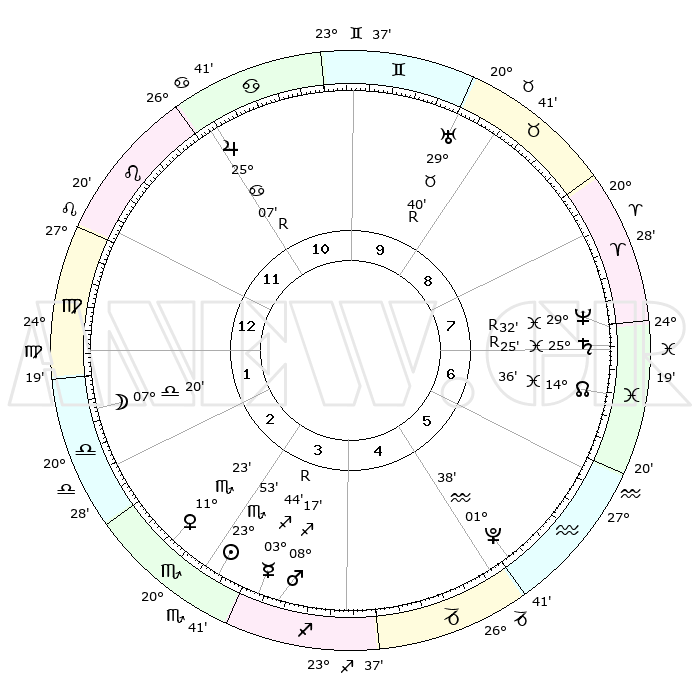 | | ΘΕΣΕΙΣ ΠΛΑΝΗΤΩΝ ΑΣΤΡΟΛΟΓΙΚΟΥ ΧΑΡΤΗ ΤΗΣ ΣΤΙΓΜΗΣ ΑΥΤΗΣ | | | | Πλανήτης | Ζώδιο | Μοίρες | Δεκαήμ. | Σε οίκο | Απόκλιση | | Ακμές των οίκων | | Ηλιος | Σκορπιός | 23°50' | Τρίτο | 3 | 18 S 44 | | 1ος | 08°36' | Παρθένος | | Σελήνη | Ζυγός | 06°41' | Πρώτο | 2 | 04 S 17 | | 2ος | 03°20' | Ζυγός | | Ερμής | Τοξότης | 03°48'R | Πρώτο | 3 | 21 S 49 | | 3ος | 02°42' | Σκορπιός | | Αφροδίτη | Σκορπιός | 11°19' | Δεύτερο | 3 | 14 S 06 | | 4ος | 05°39' | Τοξότης | | Αρης | Τοξότης | 08°15' | Πρώτο | 4 | 22 S 12 | | 5ος | 09°19' | Αιγόκερως | | Δίας | Καρκίνος | 25°07'R | Τρίτο | 11 | 21 N 13 | | 6ος | 10°41' | Υδροχόος | | Κρόνος | Ιχθείς | 25°25'R | Τρίτο | 7 | 04 S 03 | | 7ος | 08°36' | Ιχθείς | | Ουρανός | Ταύρος | 29°40'R | Τρίτο | 9 | 19 N 52 | | 8ος | 03°20' | Κριός | | Ποσειδώνας | Ιχθείς | 29°32'R | Τρίτο | 7 | 01 S 26 | | 9ος | 02°42' | Ταύρος | | Πλούτωνας | Υδροχόος | 01°38' | Πρώτο | 5 | 23 S 28 | | 10ος | 05°39' | Δίδυμοι | | Β. Δεσμός | Ιχθείς | 14°36' | Δεύτερο | 7 | 06 S 04 | | 11ος | 09°19' | Καρκίνος | | Ωροσκόπος | Παρθένος | 08°36' | Πρώτο | | | 12ος | 10°41' | Λέων | | Μεσουράνημα | Δίδυμοι | 05°39' | Πρώτο | | | |