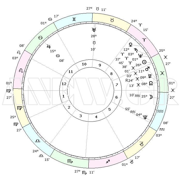 | | ΘΕΣΕΙΣ ΠΛΑΝΗΤΩΝ ΑΣΤΡΟΛΟΓΙΚΟΥ ΧΑΡΤΗ ΤΗΣ ΣΤΙΓΜΗΣ ΑΥΤΗΣ | | | | Πλανήτης | Ζώδιο | Μοίρες | Δεκαήμ. | Σε οίκο | Απόκλιση | | Ακμές των οίκων | | Ηλιος | Ιχθείς | 25°57' | Τρίτο | 8 | 01 S 36 | | 1ος | 13°44' | Λέων | | Σελήνη | Υδροχόος | 24°22' | Τρίτο | 7 | 14 S 39 | | 2ος | 05°54' | Παρθένος | | Ερμής | Ιχθείς | 09°26'R | Πρώτο | 8 | 06 S 08 | | 3ος | 02°47' | Ζυγός | | Αφροδίτη | Κριός | 12°33' | Δεύτερο | 9 | 04 N 02 | | 4ος | 05°08' | Σκορπιός | | Αρης | Ιχθείς | 10°60' | Δεύτερο | 8 | 08 S 27 | | 5ος | 10°30' | Τοξότης | | Δίας | Καρκίνος | 15°08' | Δεύτερο | 12 | 22 N 56 | | 6ος | 14°08' | Αιγόκερως | | Κρόνος | Κριός | 03°44' | Πρώτο | 9 | 00 S 28 | | 7ος | 13°44' | Υδροχόος | | Ουρανός | Ταύρος | 28°10' | Τρίτο | 10 | 19 N 35 | | 8ος | 05°54' | Ιχθείς | | Ποσειδώνας | Κριός | 01°38' | Πρώτο | 8 | 00 S 33 | | 9ος | 02°47' | Κριός | | Πλούτωνας | Υδροχόος | 04°55' | Πρώτο | 6 | 22 S 49 | | 10ος | 05°08' | Ταύρος | | Β. Δεσμός | Ιχθείς | 08°13' | Πρώτο | 8 | 08 S 29 | | 11ος | 10°30' | Δίδυμοι | | Ωροσκόπος | Λέων | 13°44' | Δεύτερο | | | 12ος | 14°08' | Καρκίνος | | Μεσουράνημα | Ταύρος | 05°08' | Πρώτο | | | |