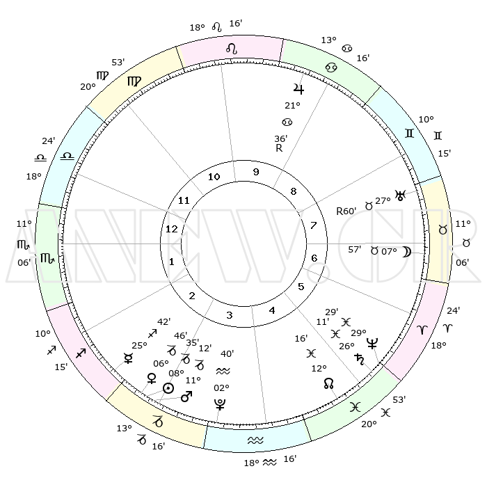 | | ΘΕΣΕΙΣ ΠΛΑΝΗΤΩΝ ΑΣΤΡΟΛΟΓΙΚΟΥ ΧΑΡΤΗ ΤΗΣ ΣΤΙΓΜΗΣ ΑΥΤΗΣ | | | | Πλανήτης | Ζώδιο | Μοίρες | Δεκαήμ. | Σε οίκο | Απόκλιση | | Ακμές των οίκων | | Ηλιος | Αιγόκερως | 08°30' | Πρώτο | 3 | 23 S 10 | | 1ος | 17°02' | Ζυγός | | Σελήνη | Ταύρος | 06°45' | Πρώτο | 7 | 17 N 43 | | 2ος | 14°42' | Σκορπιός | | Ερμής | Τοξότης | 25°34' | Τρίτο | 3 | 23 S 42 | | 3ος | 15°50' | Τοξότης | | Αφροδίτη | Αιγόκερως | 06°40' | Πρώτο | 3 | 23 S 42 | | 4ος | 19°17' | Αιγόκερως | | Αρης | Αιγόκερως | 11°09' | Δεύτερο | 3 | 23 S 50 | | 5ος | 22°13' | Υδροχόος | | Δίας | Καρκίνος | 21°37'R | Τρίτο | 10 | 21 N 56 | | 6ος | 21°52' | Ιχθείς | | Κρόνος | Ιχθείς | 26°10' | Τρίτο | 6 | 03 S 36 | | 7ος | 17°01' | Κριός | | Ουρανός | Ταύρος | 28°00'R | Τρίτο | 8 | 19 N 31 | | 8ος | 14°42' | Ταύρος | | Ποσειδώνας | Ιχθείς | 29°29' | Τρίτο | 6 | 01 S 26 | | 9ος | 15°50' | Δίδυμοι | | Πλούτωνας | Υδροχόος | 02°40' | Πρώτο | 4 | 23 S 14 | | 10ος | 19°17' | Καρκίνος | | Β. Δεσμός | Ιχθείς | 12°17' | Δεύτερο | 5 | 06 S 57 | | 11ος | 22°13' | Λέων | | Ωροσκόπος | Ζυγός | 17°02' | Δεύτερο | | | 12ος | 21°52' | Παρθένος | | Μεσουράνημα | Καρκίνος | 19°17' | Δεύτερο | | | |