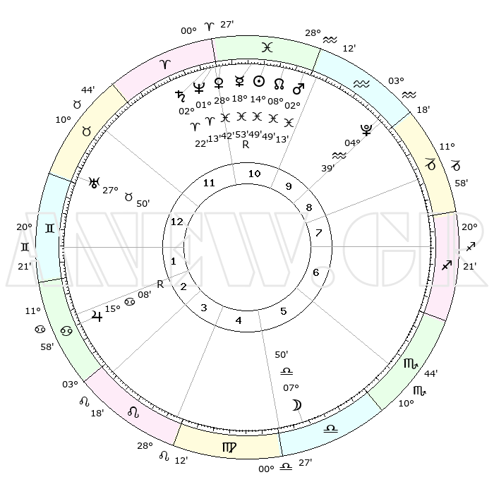 | | ΘΕΣΕΙΣ ΠΛΑΝΗΤΩΝ ΑΣΤΡΟΛΟΓΙΚΟΥ ΧΑΡΤΗ ΤΗΣ ΣΤΙΓΜΗΣ ΑΥΤΗΣ | | | | Πλανήτης | Ζώδιο | Μοίρες | Δεκαήμ. | Σε οίκο | Απόκλιση | | Ακμές των οίκων | | Ηλιος | Ιχθείς | 14°45' | Δεύτερο | 11 | 06 S 00 | | 1ος | 17°42' | Ταύρος | | Σελήνη | Ζυγός | 06°49' | Πρώτο | 6 | 04 S 58 | | 2ος | 15°16' | Δίδυμοι | | Ερμής | Ιχθείς | 18°57'R | Δεύτερο | 11 | 00 S 59 | | 3ος | 07°19' | Καρκίνος | | Αφροδίτη | Ιχθείς | 28°36' | Τρίτο | 11 | 01 S 44 | | 4ος | 29°23' | Καρκίνος | | Αρης | Ιχθείς | 02°09' | Πρώτο | 11 | 11 S 44 | | 5ος | 25°54' | Λέων | | Δίας | Καρκίνος | 15°08'R | Δεύτερο | 3 | 22 N 55 | | 6ος | 02°09' | Ζυγός | | Κρόνος | Κριός | 02°21' | Πρώτο | 12 | 01 S 01 | | 7ος | 17°42' | Σκορπιός | | Ουρανός | Ταύρος | 27°50' | Τρίτο | 1 | 19 N 30 | | 8ος | 15°16' | Τοξότης | | Ποσειδώνας | Κριός | 01°12' | Πρώτο | 11 | 00 S 43 | | 9ος | 07°19' | Αιγόκερως | | Πλούτωνας | Υδροχόος | 04°39' | Πρώτο | 10 | 22 S 51 | | 10ος | 29°23' | Αιγόκερως | | Β. Δεσμός | Ιχθείς | 08°49' | Πρώτο | 11 | 08 S 16 | | 11ος | 25°54' | Υδροχόος | | Ωροσκόπος | Ταύρος | 17°42' | Δεύτερο | | | 12ος | 02°09' | Κριός | | Μεσουράνημα | Αιγόκερως | 29°23' | Τρίτο | | | |