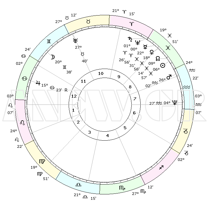 | | ΘΕΣΕΙΣ ΠΛΑΝΗΤΩΝ ΑΣΤΡΟΛΟΓΙΚΟΥ ΧΑΡΤΗ ΤΗΣ ΣΤΙΓΜΗΣ ΑΥΤΗΣ | | | | Πλανήτης | Ζώδιο | Μοίρες | Δεκαήμ. | Σε οίκο | Απόκλιση | | Ακμές των οίκων | | Ηλιος | Ιχθείς | 06°54' | Πρώτο | 9 | 08 S 59 | | 1ος | 16°14' | Καρκίνος | | Σελήνη | Δίδυμοι | 19°50' | Δεύτερο | 12 | 28 N 13 | | 2ος | 06°41' | Λέων | | Ερμής | Ιχθείς | 22°31' | Τρίτο | 9 | 00 S 34 | | 3ος | 29°59' | Λέων | | Αφροδίτη | Ιχθείς | 18°51' | Δεύτερο | 9 | 05 S 42 | | 4ος | 28°60' | Παρθένος | | Αρης | Υδροχόος | 25°60' | Τρίτο | 8 | 13 S 53 | | 5ος | 04°48' | Σκορπιός | | Δίας | Καρκίνος | 15°23'R | Δεύτερο | 12 | 22 N 53 | | 6ος | 12°48' | Τοξότης | | Κρόνος | Κριός | 01°25' | Πρώτο | 10 | 01 S 24 | | 7ος | 16°14' | Αιγόκερως | | Ουρανός | Ταύρος | 27°40' | Τρίτο | 11 | 19 N 27 | | 8ος | 06°41' | Υδροχόος | | Ποσειδώνας | Κριός | 00°55' | Πρώτο | 10 | 00 S 50 | | 9ος | 29°59' | Υδροχόος | | Πλούτωνας | Υδροχόος | 04°26' | Πρώτο | 7 | 22 S 53 | | 10ος | 28°60' | Ιχθείς | | Β. Δεσμός | Ιχθείς | 09°14' | Πρώτο | 9 | 08 S 06 | | 11ος | 04°48' | Ταύρος | | Ωροσκόπος | Καρκίνος | 16°14' | Δεύτερο | | | 12ος | 12°48' | Δίδυμοι | | Μεσουράνημα | Ιχθείς | 28°60' | Τρίτο | | | |