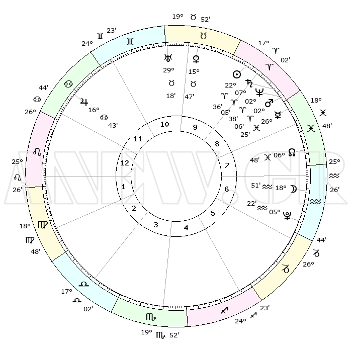 | | ΘΕΣΕΙΣ ΠΛΑΝΗΤΩΝ ΑΣΤΡΟΛΟΓΙΚΟΥ ΧΑΡΤΗ ΤΗΣ ΣΤΙΓΜΗΣ ΑΥΤΗΣ | | | | Πλανήτης | Ζώδιο | Μοίρες | Δεκαήμ. | Σε οίκο | Απόκλιση | | Ακμές των οίκων | | Ηλιος | Κριός | 22°32' | Τρίτο | 9 | 08 N 46 | | 1ος | 04°54' | Λέων | | Σελήνη | Υδροχόος | 17°57' | Δεύτερο | 7 | 17 S 09 | | 2ος | 26°18' | Λέων | | Ερμής | Ιχθείς | 26°19' | Τρίτο | 9 | 03 S 45 | | 3ος | 22°01' | Παρθένος | | Αφροδίτη | Ταύρος | 15°42' | Δεύτερο | 10 | 16 N 35 | | 4ος | 23°37' | Ζυγός | | Αρης | Κριός | 02°03' | Πρώτο | 9 | 00 S 06 | | 5ος | 29°29' | Σκορπιός | | Δίας | Καρκίνος | 16°43' | Δεύτερο | 12 | 22 N 46 | | 6ος | 04°24' | Αιγόκερως | | Κρόνος | Κριός | 07°04' | Πρώτο | 9 | 00 N 50 | | 7ος | 04°54' | Υδροχόος | | Ουρανός | Ταύρος | 29°18' | Τρίτο | 10 | 19 N 50 | | 8ος | 26°18' | Υδροχόος | | Ποσειδώνας | Κριός | 02°38' | Πρώτο | 9 | 00 S 09 | | 9ος | 22°01' | Ιχθείς | | Πλούτωνας | Υδροχόος | 05°22' | Πρώτο | 7 | 22 S 47 | | 10ος | 23°37' | Κριός | | Β. Δεσμός | Ιχθείς | 06°48' | Πρώτο | 8 | 09 S 01 | | 11ος | 29°29' | Ταύρος | | Ωροσκόπος | Λέων | 04°54' | Πρώτο | | | 12ος | 04°24' | Καρκίνος | | Μεσουράνημα | Κριός | 23°37' | Τρίτο | | | |