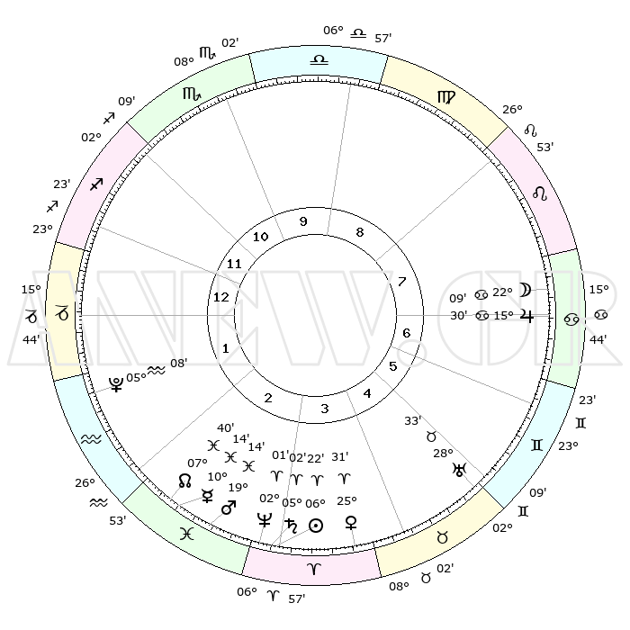 | | ΘΕΣΕΙΣ ΠΛΑΝΗΤΩΝ ΑΣΤΡΟΛΟΓΙΚΟΥ ΧΑΡΤΗ ΤΗΣ ΣΤΙΓΜΗΣ ΑΥΤΗΣ | | | | Πλανήτης | Ζώδιο | Μοίρες | Δεκαήμ. | Σε οίκο | Απόκλιση | | Ακμές των οίκων | | Ηλιος | Κριός | 06°17' | Πρώτο | 3 | 02 N 30 | | 1ος | 19°52' | Τοξότης | | Σελήνη | Καρκίνος | 21°05' | Τρίτο | 7 | 25 N 36 | | 2ος | 24°36' | Αιγόκερως | | Ερμής | Ιχθείς | 10°11' | Δεύτερο | 3 | 08 S 07 | | 3ος | 03°31' | Ιχθείς | | Αφροδίτη | Κριός | 25°25' | Τρίτο | 4 | 09 N 14 | | 4ος | 08°49' | Κριός | | Αρης | Ιχθείς | 19°10' | Δεύτερο | 3 | 05 S 16 | | 5ος | 06°48' | Ταύρος | | Δίας | Καρκίνος | 15°29' | Δεύτερο | 7 | 22 N 54 | | 6ος | 29°26' | Ταύρος | | Κρόνος | Κριός | 05°02' | Πρώτο | 3 | 00 N 03 | | 7ος | 19°52' | Δίδυμοι | | Ουρανός | Ταύρος | 28°33' | Τρίτο | 5 | 19 N 40 | | 8ος | 24°36' | Καρκίνος | | Ποσειδώνας | Κριός | 02°01' | Πρώτο | 3 | 00 S 24 | | 9ος | 03°31' | Παρθένος | | Πλούτωνας | Υδροχόος | 05°08' | Πρώτο | 2 | 22 S 48 | | 10ος | 08°49' | Ζυγός | | Β. Δεσμός | Ιχθείς | 07°40' | Πρώτο | 3 | 08 S 41 | | 11ος | 06°48' | Σκορπιός | | Ωροσκόπος | Τοξότης | 19°52' | Δεύτερο | | | 12ος | 29°26' | Σκορπιός | | Μεσουράνημα | Ζυγός | 08°49' | Πρώτο | | | |